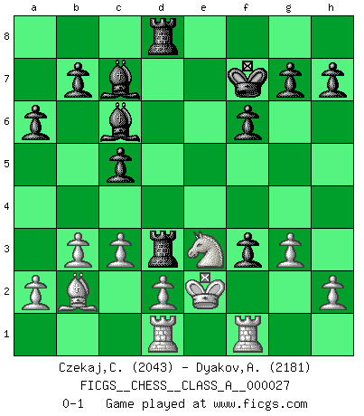Last move : 0-1 2007 October 30 13:3:26 [Event "FICGS__CHESS__CLASS_A__000027"] [Site "FICGS"] [Date "2007.08.29"] [Round "1"] [White "Czekaj,Christophe"] [Black "Dyakov,Alexander"] [Result "0-1"] [WhiteElo "2043"] [BlackElo "2181"] 1.Nc3 d5 2.e4 Nf6 3.e5 Nfd7 4.Nxd5 Nxe5 5.Ne3 c5 6.Nf3 Nxf3+ 7.Qxf3 Nc6 8.Bb5 Bd7 9.c3 a6 10.Bxc6 Bxc6 11.Qg3 Qd3 12.Qg4 Rd8 13.Qe2 e5 14.Qxd3 Rxd3 15.Ke2 e4 16.f3 f6 17.b3 Kf7 18.Rf1 Bd6 19.g3 Bc7 20.Bb2 Rhd8 21.Rad1 exf3+ 0-1 Dunst (Sleipner, Heinrichsen) Opening Player Black won this chess game. Follow this game move after move (download)Only sissies Castle. (Rob Sillars) Besser ein falscher Plan, logisch durchgeführt, als gar kein Plan. (Viktor Kortschnoi) La única cosa que los jugadores de Ajedrez tienen en común, es el Ajedrez. (Lodewijk Prins) Il n'y a plus de joueurs du niveau de Jacob Murray dont la seule quête est le beau jeu, le plaisir de voir les pièces construire quelque chose. Sur 10 idées à la minute, 9 seront sans intérêt, la dernière s'avèrera géniale. (Christian Bauer) Fortune favours the audacious. (Desiderius Erasmus)