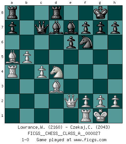 Last move : 1-0 2007 November 20 13:8:29 [Event "FICGS__CHESS__CLASS_A__000027"] [Site "FICGS"] [Date "2007.08.29"] [Round "1"] [White "Lowrance,Wayne"] [Black "Czekaj,Christophe"] [Result "1-0"] [WhiteElo "2160"] [BlackElo "2043"] 1.e4 d5 2.exd5 Qxd5 3.Nc3 Qd8 4.Nf3 Nf6 5.d4 c6 6.Bc4 b5 7.Bd3 e6 8.O-O Be7 9.Ne4 Nbd7 10.a4 bxa4 11.Nxf6+ Nxf6 12.Rxa4 O-O 13.Qe2 Qc7 14.Bd2 Bd7 15.b4 Rfb8 16.c4 c5 17.b5 cxd4 18.Nxd4 Rd8 19.Ba5 1-0 Scandinavian (centre counter) defense Kingside Castling by player White (move 8) Kingside Castling by player Black (move 12) Player White won this chess game. Follow this game move after move (download)Is Bobby Fischer quite sane ? (Salo Flohr) Glücklicherweise sind Großmeister Ruben Fines reine Schachbücher weniger phallozentrisch [als seine Schachpsychologie] und deswegen auch weniger lächerlich. (Nigel Short) La mitad de las variaciones que son calculadas en una partida de torneo, resultan ser completamente superfluas. Desafortunadamente, nadie sabe por adelantado cual mitad. (Jan Tinman) Un millionnaire : 'Monsieur Steinitz ! Vous ne participez aux tournois que pour l'argent, alors que moi je n'y viens que pour l'honneur.' Steinitz : 'Chacun joue pour ce qu'il n'a pas'... Remember : Your focus determines your reality. (Qui-Gon Jinn in Star Wars ep.1)