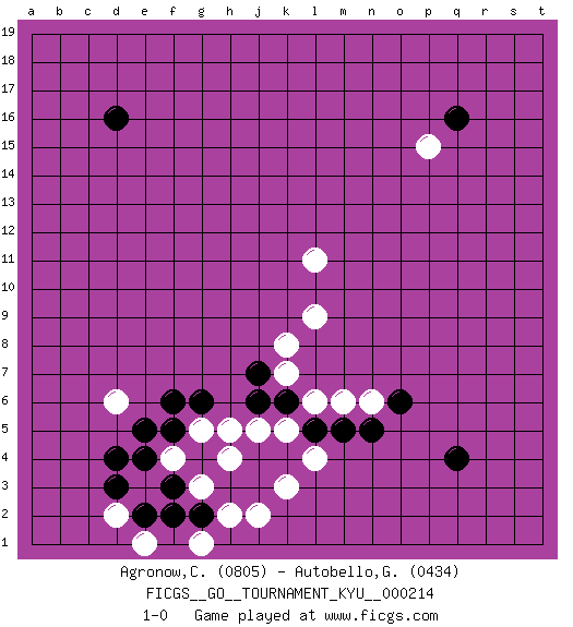 Last move : 1-0 2023 July 29 13:13:40 [Event "FICGS__GO__TOURNAMENT_KYU__000214"] [Site "FICGS"] [Date "2023.05.11"] [Round "1"] [Black "Agronow,Cosmo"] [White "Autobello,Giovanni"] [Result "1-0"] [Rating 1 "0805"] [Rating 2 "0434"] 1.d4 d6 2.q16 l11 3.q4 p15 4.d16 l9 5.j6 k7 6.j7 k8 7.m5 l6 8.l5 m6 9.o6 n6 10.n5 k5 11.k6 l4 12.k4 j5 13.j4 h5 14.f6 g5 15.f5 f4 16.e5 h4 17.g6 k3 18.j3 j2 19.h3 g3 20.g2 h2 21.f2 e3 22.d3 d2 23.e2 e1 24.f3 g1 25.e4 1-0 This go game has been lost on time (started : 2023.05.11 19:44:41) Follow this game move after move (download)A few moments to learn, a lifetime to master. (Ancient proverb) . 'gn is not allowed in chess unless n is an integer between 1 and 8 inclusive, where 1 and 8 are to interpreted as the standard numerals standing for integers in the ordered real-closed field R, with the *canonical* ordering. (As opposed to, say, an integer in the domain Z[2+i*sqrt(5)] or an integer in some exotic Grothendieck topos). (Normajean Yates)