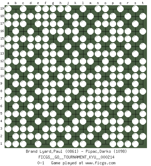 Last move : 0-1 2023 November 22 19:3:20 [Event "FICGS__GO__TOURNAMENT_KYU__000214"] [Site "FICGS"] [Date "2023.05.11"] [Round "1"] [Black "Brand Lyard,Paul"] [White "Pipac,Darko"] [Result "0-1"] [Rating 1 "0861"] [Rating 2 "1098"] 1.c13 q4 2.b8 d5 3.k11 k16 4.n12 n13 5.e9 n11 6.j4 j5 7.g15 l10 8.d16 l12 9.f11 h9 10.e3 s10 11.q8 q10 12.c18 k4 13.g16 f8 14.n6 q16 15.h18 j18 16.e13 h13 17.b14 g11 18.n18 o18 19.e18 m7 20.b11 p7 21.p12 o12 22.n2 q12 23.a2 c3 24.c6 d6 25.m15 n15 26.a16 g3 27.d14 n4 28.q2 m2 29.k7 k8 30.k14 l14 31.b16 r7 32.c10 h15 33.g6 g5 34.s14 s15 35.s5 s4 36.q18 p17 37.k5 j3 38.n9 n7 39.d1 e2 40.d11 h16 41.e15 j11 42.a18 k6 43.c17 k13 44.f18 c5 45.l18 k18 46.s18 p2 47.h7 j7 48.e17 f6 49.d19 f9 50.a9 e8 51.d12 m16 52.f14 f10 53.a12 g14 54.h1 d2 55.p5 q5 56.a5 h4 57.b12 g7 58.s12 s17 59.o10 p11 60.g19 h17 61.c15 a4 62.t1 t2 63.p14 p13 64.f13 r14 65.c9 n8 66.l5 o9 67.r2 m5 68.h10 k10 69.o16 p15 70.s16 t16 71.k1 r3 72.a6 s13 73.l8 r18 74.c7 d7 75.b19 b5 76.s8 l4 77.e16 j14 78.m19 l17 79.p19 t18 80.t6 p18 81.f1 s19 82.t12 r16 83.j19 b6 84.h2 c1 85.r9 a7 86.e19 b7 87.k19 m14 88.e5 c8 89.o3 q9 90.c4 q17 91.h12 l11 92.a1 q19 93.o1 p3 94.j17 k17 95.k2 n17 96.a14 a8 97.m1 n3 98.o14 b9 99.m9 a10 100.s11 s9 101.p8 o19 102.r1 f2 103.j15 l6 104.k12 l9 105.o6 s2 106.b17 o2 107.q15 n19 108.f16 m18 109.e11 l19 110.r11 j16 111.a3 j12 112.l2 n1 113.e12 s1 114.f4 p1 115.s6 q1 116.t3 k15 117.b2 h19 118.h5 g18 119.f17 h6 120.q14 q3 121.m11 q13 122.t11 m12 123.t8 r10 124.t4 d9 125.q6 q7 126.a13 e10 127.t9 o4 128.m10 l7 129.g10 g9 130.t13 t14 131.a15 m8 132.h8 s3 133.k19 r5 134.k3 j10 135.t7 h11 136.k5 g12 137.b4 c2 138.p10 b1 139.d4 b3 140.a2 r8 141.d10 n10 142.e7 r12 143.t10 q11 144.r6 s7 145.c12 t5 146.r2 p6 147.a6 o11 148.t7 p9 149.r6 l5 150.m9 pass 151.s11 pass 152.t3 g17 153.r11 b10 154.s12 g13 155.j8 f19 156.j9 g19 157.l13 h3 158.o10 l15 159.n9 t12 160.g2 t11 161.o5 t4 162.t9 m10 163.m9 j19 164.j1 m13 165.r11 d3 166.p4 e1 167.l3 f3 168.k11 f5 169.s8 e6 170.t6 a5 171.j2 g4 172.o13 e4 173.o7 o8 174.d17 m3 175.c14 l1 176.q8 g1 177.j2 n14 178.j1 r15 179.k2 o15 180.l3 n5 181.o14 m6 182.o6 f7 183.c11 k12 184.g2 n9 185.d13 s11 186.e14 k9 187.q14 g8 188.p5 p10 189.f15 a11 190.d15 f12 191.c16 p8 192.t8 t10 193.b18 s6 194.b13 q6 195.b15 o13 196.c19 p14 197.o5 q15 198.h2 p4 199.d18 n6 200.a17 a19 201.g15 o7 202.c14 f15 203.c12 b12 204.c10 c11 205.d14 b14 206.e11 k3 207.d16 l2 208.f11 k1 209.f13 h1 210.e16 r1 211.f16 g16 212.a17 q2 213.d13 b18 214.f17 e18 215.c15 b13 216.c17 c18 217.e14 a18 218.d12 c9 219.d15 d10 220.a15 a1 221.a16 b2 222.e12 a3 223.a13 p16 224.d19 d18 225.b16 o17 226.d17 n16 227.c13 d11 228.b17 e19 229.b15 c19 230.k2 j2 231.e15 f14 232.e17 a12 233.d4 a14 234.e13 c4 235.c16 f18 236.c15 d16 237.c14 e15 238.d12 e12 239.c13 d15 240.a16 d13 241.e16 d14 242.b16 f16 243.d17 c12 244.e17 f17 245.c17 b15 246.c16 a15 247.e13 a17 248.f13 b17 249.c16 e14 250.d17 e17 251.c14 b16 252.c15 c17 253.e13 f13 254.t7 c13 255.c14 c15 256.h8 j8 257.t8 t6 258.t9 s8 259.t7 t8 260.e11 f11 261.p5 o5 262.h2 h7 263.c6 g2 264.pass pass 265.pass pass 266.pass pass 267.pass c7 268.g10 h10 269.pass pass 270.pass pass 271.pass pass 0-1 Follow this game move after move (download)Be a little patient. Keshi works ! (Anonymous) He who fights with monsters should be careful lest he thereby become a monster. (Friedrich Nietzsche, Beyond Good and Evil)