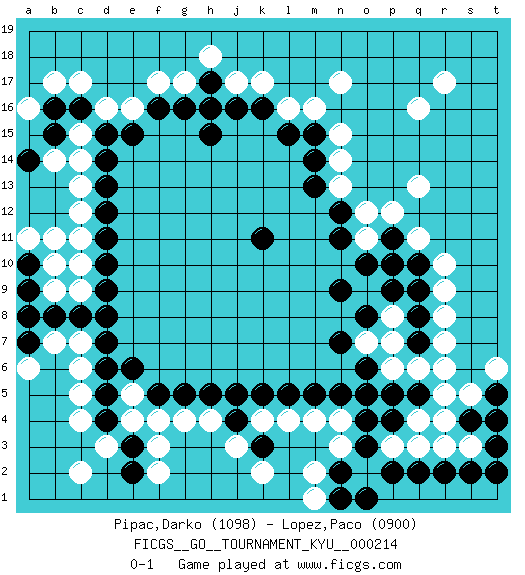 Last move : 0-1 2023 September 25 20:35:11 [Event "FICGS__GO__TOURNAMENT_KYU__000214"] [Site "FICGS"] [Date "2023.05.11"] [Round "1"] [Black "Pipac,Darko"] [White "Lopez,Paco"] [Result "0-1"] [Rating 1 "1098"] [Rating 2 "0900"] 1.d4 c6 2.d6 e5 3.d5 q4 4.k5 d16 5.k11 q16 6.d15 c15 7.d14 e16 8.k16 n17 9.p4 p3 10.o3 r3 11.q5 r5 12.o5 q13 13.q10 r7 14.q7 q6 15.p5 p6 16.o6 p7 17.q8 p8 18.p9 r8 19.q9 n13 20.n12 h16 21.h15 k17 22.j16 j17 23.e15 c14 24.d13 c13 25.d12 c12 26.d11 c11 27.d10 c10 28.d9 c9 29.d8 c7 30.d7 c5 31.f16 f17 32.g16 g17 33.h17 h18 34.h16 l16 35.l15 m16 36.m13 n14 37.m14 o12 38.n11 o11 39.o10 q11 40.o8 o7 41.n7 r6 42.p2 q3 43.o1 r9 44.p11 p12 45.p10 r10 46.n9 e4 47.e3 f3 48.q2 d3 49.c8 c4 50.b8 j3 51.j4 h4 52.h5 g4 53.g5 k4 54.j5 l4 55.l5 m4 56.m5 n4 57.o4 n3 58.n2 m2 59.e6 c2 60.f5 f4 61.n5 m1 62.m15 n15 63.r2 s3 64.s2 b7 65.a10 b11 66.a7 a6 67.a8 b9 68.a9 a11 69.t3 t4 70.t2 r17 71.s4 r4 72.t5 s5 73.t4 t6 74.n1 b10 75.e2 f2 76.k3 k2 77.c16 c17 78.b16 b17 79.b15 b14 80.a14 a16 81.pass pass 0-1 Follow this game move after move (download)Keep sente in the opening. A premature attack loses sente. (Anonymous) The only sure thing about luck is that it will change. (Wilson Mizner)