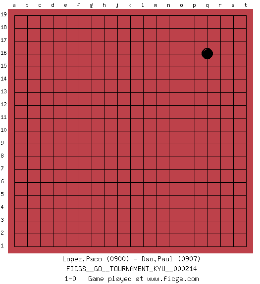 Last move : 1-0 2023 June 11 5:48:56 [Event "FICGS__GO__TOURNAMENT_KYU__000214"] [Site "FICGS"] [Date "2023.05.11"] [Round "1"] [Black "Lopez,Paco"] [White "Dao,Paul"] [Result "1-0"] [Rating 1 "0900"] [Rating 2 "0907"] 1.q16 1-0 This go game has been lost on time (started : 2023.05.11 19:44:41) Follow this game move after move (download)Conservative and slow will win. Believe it ! (Anonymous) Programming can only do so much before it becomes too much. (Don Groves)