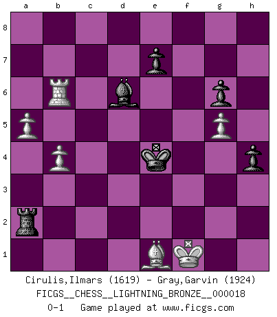 Last move : 0-1 2007 August 30 17:48:17 [Event "FICGS__CHESS__LIGHTNING_BRONZE__000018"] [Site "FICGS"] [Date "2007.08.30"] [Round "1"] [White "Cirulis,Ilmars"] [Black "Gray,Garvin"] [Result "0-1"] [WhiteElo "1619"] [BlackElo "1924"] 1.e4 c5 2.Nf3 d6 3.d4 cxd4 4.Nxd4 Nf6 5.Nc3 g6 6.Be3 Bg7 7.f3 O-O 8.Qd2 Nc6 9.O-O-O d5 10.exd5 Nxd5 11.Nxc6 bxc6 12.Nxd5 cxd5 13.Qxd5 Qc7 14.Qc5 Qb7 15.b3 Bf5 16.Qa5 Qc6 17.Bc4 Qf6 18.c3 Qxc3+ 19.Qxc3 Bxc3 20.g4 Be6 21.Bxe6 fxe6 22.Rd3 Be5 23.Bh6 Rfc8+ 24.Kb1 Kf7 25.h4 Rd8 26.Rxd8 Rxd8 27.Kc2 Bf6 28.Be3 h5 29.g5 Be5 30.f4 Bd6 31.Rd1 Rc8+ 32.Kd3 e5 33.fxe5 Bxe5 34.Bxa7 Rd8+ 35.Ke2 Ra8 36.Rd7 Ke6 37.Rb7 Bg3 38.a4 Bxh4 39.Be3 Bg3 40.Kf3 Bd6 41.Rb5 Rf8+ 42.Kg2 Rc8 43.a5 Rc2+ 44.Kg1 Ra2 45.Bf2 Kd7 46.Kf1 Kc6 47.Rb6+ Kd5 48.b4 Ke4 49.Be1 h4 0-1 Sicilian : Dragon, Yugoslav attack, 7...O-O Kingside Castling by player Black (move 7) Queenside Castling by player White (move 9) Player Black won this chess game. Follow this game move after move (download)Many Chess players were surprised when after the game, Fischer quietly explained: 'I had already analyzed this possibility' in a position which I thought was not possible to foresee from the opening. (Mikhail Tal) Rubinstein ist ein Turmendspiel, welches die Götter vor tausenden von Jahren begannen. (Savielly Grigorievitsch Tartakower) Sin errores no puede haber brillantez. (Emanuel Lasker) Le joueur d'Echecs qui veut atteindre le top est obligé de développer son propre credo créatif. Alexeï Stepanovicth Souétine. Il est facile d'écrire des livres ! Ce qui est difficile, c'est de jouer ! (Alexeï Stepanovicth Souétine) A government big enough to give you everything you want is strong enough to take everything you have. (Thomas Jefferson)