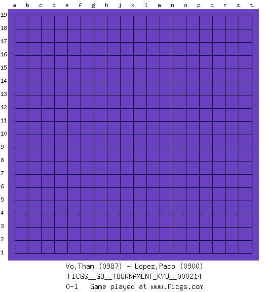 Last move : 0-1 2023 June 11 5:48:56 [Event "FICGS__GO__TOURNAMENT_KYU__000214"] [Site "FICGS"] [Date "2023.05.11"] [Round "1"] [Black "Vo,Tham"] [White "Lopez,Paco"] [Result "0-1"] [Rating 1 "0987"] [Rating 2 "0900"] 0-1 This go game has been lost on time (started : 2023.05.11 19:44:41) Follow this game move after move (download)Stop on second, extend on third. (Anonymous) To err is human, but to really foul things up requires a computer. (Farmer's Almanac, 1978)