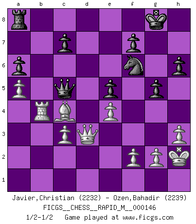 Last move : 1/2-1/2 2023 July 28 13:40:0 [Event "FICGS__CHESS__RAPID_M__000146"] [Site "FICGS"] [Date "2023.05.12"] [Round "1"] [White "Javier,Christian"] [Black "Ozen,Bahadir"] [Result "1/2-1/2"] [WhiteElo "2232"] [BlackElo "2239"] 1.e4 e5 2.Nf3 Nc6 3.Bb5 a6 4.Ba4 Nf6 5.O-O Be7 6.Re1 b5 7.Bb3 O-O 8.a4 b4 9.d4 d6 10.dxe5 dxe5 11.Nbd2 Bc5 12.h3 h6 13.Qe2 Qe7 14.Nc4 Be6 15.Be3 Rfd8 16.Bxc5 Qxc5 17.Rad1 Nd4 18.Nxd4 Rxd4 19.Rxd4 Qxd4 20.Rd1 Bxc4 21.Bxc4 Qxb2 22.Kh2 Qc3 23.Rd3 Qb2 24.Rd1 Qc3 25.Rd3 Qb2 26.Rb3 Qd4 27.Rxb4 Qc5 28.Rb3 Qc6 29.Rb4 Qc5 30.c3 Qc6 31.a5 g5 32.Qd3 Qc5 1/2-1/2 Follow this game move after move (download)There is no remorse like the remorse of Chess. (H. G. Wells) Du kannst im Schach nur gut werden, wenn du das Spiel liebst. (Robert James Fischer) El ganar no lo es todo... pero el perder es nada. (Mednis) Il n'y a pas de prix trop élevé au scalp de l'ennemi. (Koblentz) Art disturbs, science reassures. (Georges Braque, Le Jour et la Nuit)