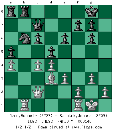 Last move : 1/2-1/2 2023 June 24 19:51:52 [Event "FICGS__CHESS__RAPID_M__000146"] [Site "FICGS"] [Date "2023.05.12"] [Round "1"] [White "Ozen,Bahadir"] [Black "Swiatek,Janusz"] [Result "1/2-1/2"] [WhiteElo "2239"] [BlackElo "2209"] 1.d4 Nf6 2.Nf3 d5 3.c4 c6 4.e3 Bf5 5.Nc3 e6 6.Nh4 Bg6 7.Nxg6 hxg6 8.Bd2 Nbd7 9.g3 Bb4 10.Qb3 a5 11.Be2 Bxc3 12.Bxc3 Qc7 13.O-O Nb6 14.c5 Nbd7 15.Rab1 O-O 16.Qc2 Rfb8 17.a4 Ne4 18.Bd3 Nxc3 19.bxc3 b6 20.cxb6 Nxb6 21.c4 1/2-1/2 Follow this game move after move (download)No one ever won a game by resigning. (Unknown) Die FIDE ist dabei in die Hände der russischen Mafia zu fallen. (Larry Evans) Bobby es la celebridad menos entendida y malinterpretada que camina el la faz de esta tierra. (Yasser Seirawan) Ce qui caractérise les parties de combat, c'est que si le défenseur a constamment de difficiles problèmes à résoudre, l'attaquant doit chercher sans relâche de nouvelles possibilités d'attaque. (Koblentz) The arrogant army will lose certainly the battle. (Chinese proverb)