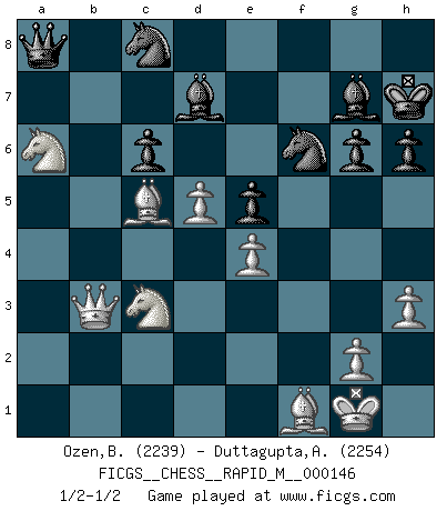 Last move : 1/2-1/2 2023 July 18 11:24:23 [Event "FICGS__CHESS__RAPID_M__000146"] [Site "FICGS"] [Date "2023.05.12"] [Round "1"] [White "Ozen,Bahadir"] [Black "Duttagupta,Aniruddha"] [Result "1/2-1/2"] [WhiteElo "2239"] [BlackElo "2254"] 1.d4 Nf6 2.c4 g6 3.Nc3 Bg7 4.e4 d6 5.Nf3 O-O 6.Be2 e5 7.O-O Nc6 8.d5 Ne7 9.b4 a5 10.bxa5 Rxa5 11.Nd2 Ne8 12.Nb3 Ra8 13.a4 f5 14.f3 fxe4 15.fxe4 Rxf1+ 16.Bxf1 b6 17.Be3 Nf6 18.h3 h6 19.a5 bxa5 20.Nxa5 Bd7 21.c5 dxc5 22.Qb3 Kh7 23.Nb7 Qc8 24.Rxa8 Qxa8 25.Nxc5 Nc8 26.Na6 c6 27.Bc5 1/2-1/2 Follow this game move after move (download)Winning isn't everything... but losing is nothing. (Mednis) Das ganze Leben mit einer Ehefrau ist wie ein Endspiel mit ungleichfarbigen Läufern. (Viktor Kortschnoi) Botvinnik trató de alejar el misterio referente al Ajedrez, siempre relacionandolo a situaciones de la vida diaria. Solía llamar al Ajedrez un problema inexacto típico, similar a aquellos en que la gente tiene siempre que resolver a cada día. (Garry Kasparov) Je ne crois pas en la psychologie, je crois aux bons coups. (Robert Fischer) Control your own destiny or someone else will. (Jack Welch)
