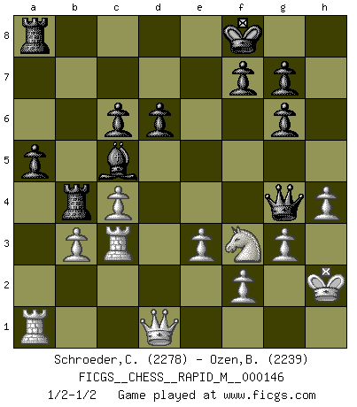 Last move : 1/2-1/2 2023 June 27 16:28:52 [Event "FICGS__CHESS__RAPID_M__000146"] [Site "FICGS"] [Date "2023.05.12"] [Round "1"] [White "Schroeder,Christoph"] [Black "Ozen,Bahadir"] [Result "1/2-1/2"] [WhiteElo "2278"] [BlackElo "2239"] 1.b3 e5 2.Bb2 Nc6 3.e3 Nf6 4.Bb5 Bd6 5.Na3 Na5 6.Be2 a6 7.Nf3 Qe7 8.Nb1 O-O 9.d3 b5 10.O-O Bb7 11.c4 bxc4 12.bxc4 e4 13.dxe4 Bxe4 14.Nbd2 Bg6 15.Nb3 Nxb3 16.axb3 Rfb8 17.Bd3 Ne4 18.Bd4 Nc5 19.Bxg6 hxg6 20.Bxc5 Bxc5 21.Qc2 a5 22.Rfd1 c6 23.h4 Qe6 24.Rd3 Qe4 25.Qd1 d6 26.g3 Qg4 27.Rc3 Rb4 28.Kh2 Kf8 29.Kg2 Qe4 30.Kh2 Qg4 31.Kg2 Qe4 32.Kh2 Qg4 1/2-1/2 Follow this game move after move (download)Later, I began to succeed in decisive games. Perhaps because I realized a very simple truth: not only was I worried, but also my opponent. (Mikhail Tal) Es liegt in der Natur, vernüftig zu denken und unlogisch zu handeln. (Anatole France) Los Peones son nacidos libres, y aún así, se encuentran por doquier encadenados. (Rick Kennedy) Si rien de grave n'est détecté lors de l'analyse d'une position, on joue alors le coup. Seconde règle de Blumenfeld. Beta. Software undergoes beta testing shortly before it's released. Beta is latin for still doesn't work. (Anonymous)