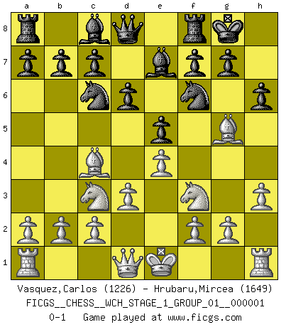 Last move : 0-1 2006 August 10 5:10:18 [Event "FICGS__CHESS__WCH_STAGE_1_GROUP_01__000001"] [Site "FICGS"] [Date "2006.07.01"] [Round "1"] [White "Vasquez,Carlos"] [Black "Hrubaru,Mircea"] [Result "0-1"] [WhiteElo "1226"] [BlackElo "1649"] 1.e4 e5 2.Nf3 Nc6 3.Bc4 Be7 4.d3 d6 5.h3 Nf6 6.Bg5 O-O 7.Nc3 h6 0-1 This chess game has been lost on time (started : 2006.07.01 15:43:36) Hungarian defense Kingside Castling by player Black (move 6) Player Black won this chess game. Follow this game move after move (download)Chess is the art of analysis. (Mikhail Botvinnik) Wenn ein Kopf und ein Buch zusammenstoßen und es klingt hohl, ist es denn allemal im Buche? (Georg Christoph Lichtenberg) Hay jugadores fuertes y personas amables y yo soy un jugador fuerte. (Bobby Fischer) Karpov est une pièce de musée. (Garry Kasparov) The real voyage of discovery consists not in seeking new lands but in seeing with new eyes. (Marcel Proust)