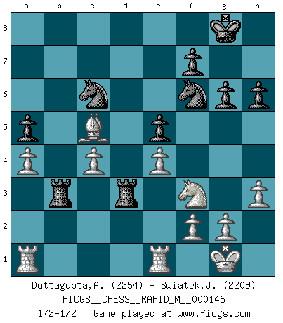 Last move : 1/2-1/2 2023 July 28 18:25:6 [Event "FICGS__CHESS__RAPID_M__000146"] [Site "FICGS"] [Date "2023.05.12"] [Round "1"] [White "Duttagupta,Aniruddha"] [Black "Swiatek,Janusz"] [Result "1/2-1/2"] [WhiteElo "2254"] [BlackElo "2209"] 1.e4 e5 2.Nf3 Nc6 3.Bc4 Nf6 4.d3 Bc5 5.c3 a6 6.O-O d6 7.a4 O-O 8.h3 h6 9.Nbd2 a5 10.Re1 Be6 11.Bb5 Na7 12.d4 Nxb5 13.dxc5 Na7 14.b3 Re8 15.cxd6 Qxd6 16.Ba3 c5 17.Qe2 Rad8 18.Nc4 Bxc4 19.Qxc4 b6 20.b4 Qd3 21.Qxd3 Rxd3 22.bxc5 bxc5 23.c4 Nc6 24.Bxc5 Rb8 25.Nh4 g6 26.Nf3 R8b3 1/2-1/2 Follow this game move after move (download)Every Chess master was once a beginner. (Chernev) Bis zum Jahr 1971 verlief in meiner Schachkariere alles glatt. Dieses dramatische Match [Fischer-Taimanov 6:0] machte mein Leben zur Hölle. (Mark Taimanov) Fischer era un maestro de claridad y un Rey del posicionamiento astuto. Sus oponentes podían ver hacia donde se dirigía pero eran impotentes para detenerlo. (Bruce Pandolfini) Le thème de l'attaque double intervient d'une manière ou d'une autre dans l'immense majorité des combinaisons. (Youri Averbakh) The hypothalamus is one of the most important parts of the brain, involved in many kinds of motivation, among other functions. The hypothalamus controls the 'Four Fs: Fighting, Fleeing, Feeding and Mating. (Unknown author)