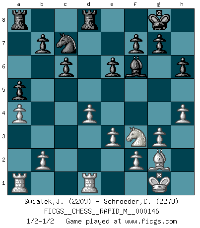 Last move : 1/2-1/2 2023 June 10 20:52:16 [Event "FICGS__CHESS__RAPID_M__000146"] [Site "FICGS"] [Date "2023.05.12"] [Round "1"] [White "Swiatek,Janusz"] [Black "Schroeder,Christoph"] [Result "1/2-1/2"] [WhiteElo "2209"] [BlackElo "2278"] 1.d4 Nf6 2.c4 e6 3.g3 d5 4.Bg2 Be7 5.Nf3 O-O 6.O-O dxc4 7.Qc2 a6 8.a4 Bd7 9.Qxc4 Bc6 10.Bg5 Bd5 11.Qc2 Be4 12.Qc1 h6 13.Bxf6 Bxf6 14.Nbd2 Bxf3 15.Nxf3 a5 16.Rd1 c6 17.h4 Na6 18.Qf4 Qc7 19.Qxc7 Nxc7 20.e3 Rfd8 1/2-1/2 Follow this game move after move (download)In blitz, the Knight is stronger than the Bishop. (Vlastimil Hort) Korrekt heißt in Deutschland die Haltung eines Mannes, dessen Benehmen nach dem Urteile seiner Nachbarn seiner Stellung angemessen ist. Um korrekt zu sein, muß man sich der Meinung der anderen anpassen... (Emanuel Lasker) Los asuntos humanos son como una partida de Ajedrez: solo aquellos que no lo toman seriamente, pueden ser llamados buenos jugadores. (Hung Tzu Ch'eng) Des idées, des idées, j'en ai cent, j'en ai mille. Des bonnes, des mauvaises, applicables, irréalisables... Il suffit de faire le tri ! (Roos) Dave, my mind is going. I can feel it. (HAL 9000 in 2001, a space odyssey)