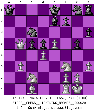 Last move : 1-0 2007 August 31 12:31:2 [Event "FICGS__CHESS__LIGHTNING_BRONZE__000020"] [Site "FICGS"] [Date "2007.08.31"] [Round "1"] [White "Cirulis,Ilmars"] [Black "Cook,Phil"] [Result "1-0"] [WhiteElo "1578"] [BlackElo "1183"] 1.e4 e6 2.d4 d5 3.e5 Nc6 4.Nf3 Bb4+ 5.c3 Be7 6.Bd3 h6 7.O-O g5 8.Na3 a6 9.h3 Na7 10.Nc2 b5 11.a4 Bd7 12.axb5 Bxb5 13.b3 c5 14.c4 Bc6 15.Rxa6 Bb7 16.Ra4 Nc6 17.Rxa8 Qxa8 18.cxd5 exd5 19.Bb5 Ba6 20.Qd3 Bxb5 21.Qxb5 1-0 French : Advance variation Kingside Castling by player White (move 7) Player White won this chess game. Follow this game move after move (download)Whoever sees no other aim in the game than that of giving checkmate to one's opponent will never become a good Chess player. (Euwe) Heutzutage gewinnt im Turnier nicht derjenige Spieler, der weitreichende Pläne entwirft, sondern einfach jener, der Zug um Zug kämpft. (David Bronstein) El Ajedrez es imaginación. (David Bronstein) Vous m'avez demandé de vous exposer quel est le fondement de la prière. Je ne fais que préparer les pièces du jeu sur la table... Nous sera-t-il permis d'en adopter les règles et si nous les appliquons scrupuleusement nous ne tarderons pas à faire mat le Roi divin ! Il ne pourra échapper à nos mains. (Sainte Thérèse d'Avila, Chemin de perfection) Question: Is 'This statement is paradoxical' a paradoxical statement ? Or is it a meta-paradox ? (Normajean Yates)
