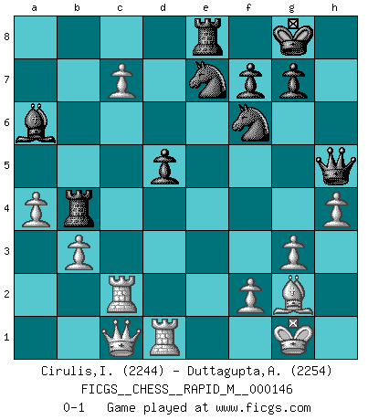 Last move : 0-1 2023 July 12 10:37:28 [Event "FICGS__CHESS__RAPID_M__000146"] [Site "FICGS"] [Date "2023.05.12"] [Round "1"] [White "Cirulis,Ilmars"] [Black "Duttagupta,Aniruddha"] [Result "0-1"] [WhiteElo "2244"] [BlackElo "2254"] 1.d4 Nf6 2.c4 e6 3.Nf3 b6 4.g3 Ba6 5.b3 Bb4+ 6.Bd2 Be7 7.Bg2 d5 8.cxd5 exd5 9.O-O O-O 10.Nc3 Re8 11.Ne5 Bb7 12.Rc1 Nbd7 13.Nd3 a5 14.Rc2 c6 15.Qc1 h6 16.Rd1 Bb4 17.Nxb4 axb4 18.Na4 Qe7 19.h4 Qxe2 20.Bxh6 Qh5 21.Bd2 c5 22.Nxb6 Nxb6 23.dxc5 Nc8 24.c6 Ba6 25.Bxb4 Ne7 26.a4 Rab8 27.c7 Rxb4 0-1 Follow this game move after move (download)Chess is a terrible game. If you have no center, your opponent has a freer position. If you do have a center, then you really have something to worry about ! (Siegbert Tarrasch) Wenn ich einen Club besuche, sind die Spieler stumm vor Staunen. (José Raúl Capablanca) Combinaciones deslumbrantes son para la mayoría, mover madera es para los pocos. (Georg Kieninger) Les échecs c'est le défi de l'alpiniste, toujours plus haut, prêt à tout pour monter à l'assaut du Roi ennemi. Les échecs, c'est de la musique en mouvement, un ballet majestueux pour les yeux. C'est de la poésie composée par les fantômes du passé qui au même titre que Rimbaud ou Verlaine méritent notre admiration. Les échecs, c'est de la peinture ou le moindre mouvement modifie le tableau pour en faire un Picasso ou un Van Gogh. Les échecs, c'est tout et rien, c'est la vie et la mort. Jjulie33 sur le forum de France-Echecs. The bottom line is always the bottom line. (Johann Piek)