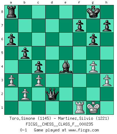 Last move : 0-1 2023 September 24 4:22:0 [Event "FICGS__CHESS__CLASS_F__000235"] [Site "FICGS"] [Date "2023.05.12"] [Round "1"] [White "Toro,Simone"] [Black "Martinez,Silvio"] [Result "0-1"] [WhiteElo "1145"] [BlackElo "1221"] 1.e4 Nc6 2.d4 e6 3.Nf3 Nge7 4.Bb5 a6 5.Ba4 b5 6.Bb3 d5 7.Nc3 dxe4 8.Nxe4 Nf5 9.O-O Ncxd4 10.Nxd4 Nxd4 11.c3 Nxb3 12.Qxb3 g6 13.Bg5 Be7 14.Bxe7 Qxe7 15.Rfd1 O-O 16.a3 Bb7 17.f3 c5 18.Nd6 Bd5 19.Qc2 Qxd6 20.Rd2 Qf4 21.Rf1 Rfd8 22.Rd3 Qf5 23.g4 Qg5 24.h3 c4 25.Rd2 Qe3+ 26.Kg2 e5 27.Kg3 Qf4+ 28.Kg2 e4 29.fxe4 Bxe4+ 30.Kg1 Rxd2 31.Qxd2 Qxd2 0-1 Follow this game move after move (download)Pawn endings are to Chess what putting is to golf. (Cecil Purdy) Fischer: 'Remis!?' Uhlmann: 'Aber es muss doch dreimal Zugwiederholung sein!' Fischer: 'Sie nehmen das Remis an, wie ich es sage, sonst spiele ich weiter und werde Sie dann schlagen!' (Robert James Fischer) Bobby Fischer es el mas grande genio de Ajedrez de todos los tiempos. (Alexander Kotov) Mais l'homme est une créature légère et illogique : semblable au joueur d'échecs, il n'aime que le processus du but à atteindre, non le but lui-même. (Dostoïevsky) Two beer, or not two beer. (Unknown)