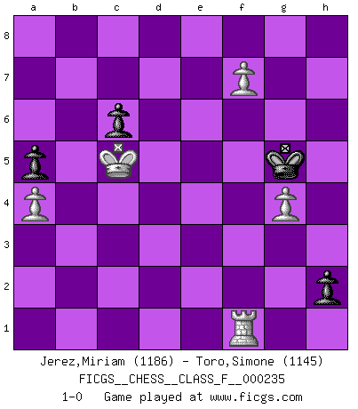Last move : 1-0 2023 September 23 12:41:41 [Event "FICGS__CHESS__CLASS_F__000235"] [Site "FICGS"] [Date "2023.05.12"] [Round "1"] [White "Jerez,Miriam"] [Black "Toro,Simone"] [Result "1-0"] [WhiteElo "1186"] [BlackElo "1145"] 1.e4 e5 2.Nf3 Nc6 3.d4 Nxd4 4.Nxd4 exd4 5.Qxd4 Nf6 6.Nc3 g6 7.Bg5 Be7 8.Nd5 O-O 9.Bxf6 Bxf6 10.Nxf6+ Kg7 11.Nxd7 f6 12.O-O-O Bxd7 13.e5 Bf5 14.exf6+ Qxf6 15.Kb1 Rfd8 16.Qxf6+ Kxf6 17.Rxd8 Rxd8 18.Bc4 Rd2 19.Kc1 Rxc2+ 20.Kd1 Rxc4 21.Re1 a5 22.b3 Rc2 23.a4 Rxf2 24.Rg1 Rc2 25.Rf1 c6 26.g4 b5 27.gxf5 g5 28.Kxc2 h5 29.Kc3 g4 30.Kd4 h4 31.Kc5 bxa4 32.bxa4 g3 33.hxg3 h3 34.g4 Kg5 35.f6 h2 36.f7 1-0 Follow this game move after move (download)First-class players lose to second-class players because second-class players sometimes play a first-class game. (Siegbert Tarrasch) Schach ist Kampf, hauptsächlich jedoch gegen die eigenen Fehler. (Savielly Grigorievitsch Tartakower) Los Peones son el alma de una partida de Ajedrez. (Francois Andre Danican Philidor) Les Echecs mettent en conflit, non pas deux intelligences, mais deux volontés. (Lasker) The existence of forgetting has never been proved: We only know that some things don't come to mind when we want them. (Friedrich Nietzsche)