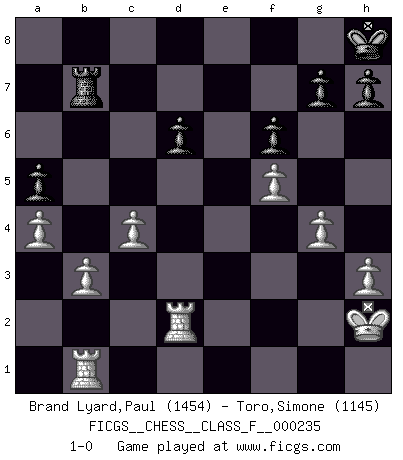 Last move : 1-0 2023 May 28 13:11:0 [Event "FICGS__CHESS__CLASS_F__000235"] [Site "FICGS"] [Date "2023.05.12"] [Round "1"] [White "Brand Lyard,Paul"] [Black "Toro,Simone"] [Result "1-0"] [WhiteElo "1454"] [BlackElo "1145"] 1.f4 d5 2.Nf3 Nc6 3.e3 f6 4.Bb5 a6 5.Bxc6+ bxc6 6.O-O Bf5 7.d3 e6 8.Re1 Bd6 9.Nc3 Ne7 10.b3 O-O 11.e4 Bg4 12.exd5 cxd5 13.h3 Bxf3 14.Qxf3 e5 15.Nxd5 Nxd5 16.Qxd5+ Kh8 17.f5 Rb8 18.g4 Rb5 19.Qg2 Bc5+ 20.Kh2 Qd4 21.Rb1 a5 22.a4 R5b8 23.Be3 Qd6 24.c4 e4 25.Qg3 Bb4 26.Qxd6 cxd6 27.Rec1 Rfe8 28.Ba7 Rb7 29.Bd4 exd3 30.Rd1 Re3 31.Bxe3 d2 32.Bxd2 Bxd2 33.Rxd2 1-0 Follow this game move after move (download)There is only one thing Fischer does in Chess without pleasure: to lose ! (Boris Spassky) Jeder weiß, dass Gasprom Putins persönliches Machtinstrument ist. Die Firma wird vom Kreml aus geleitet und wird schon deshalb nie transparent sein. (Garry Kasparov) Las Aperturas te enseñan aperturas. ¡Los Finales te enseñan Ajedrez!. (Stephan Gerzadowicz) Celui qui prend des risques peut perdre, celui qui n'en prend pas perd toujours. (Xavier Tartacover) Some people are so afraid to die that they never begin to live. (Henry Van Dyke)