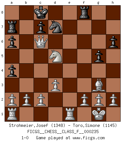 Last move : 1-0 2023 July 1 20:56:35 [Event "FICGS__CHESS__CLASS_F__000235"] [Site "FICGS"] [Date "2023.05.12"] [Round "1"] [White "Strohmeier,Josef"] [Black "Toro,Simone"] [Result "1-0"] [WhiteElo "1348"] [BlackElo "1145"] 1.e4 e5 2.Nf3 Nc6 3.Bb5 a6 4.Ba4 Nf6 5.O-O Nxe4 6.Re1 f5 7.d3 Nf6 8.Nxe5 b5 9.Nxc6 Be7 10.Nxe7 Kf8 11.Nxf5 bxa4 12.Bg5 h6 13.Bh4 d5 14.Nd4 g5 15.Bg3 Bb7 16.Ne6+ Ke8 17.Nxd8 Kxd8 18.Qf3 Rf8 19.Nc3 Kc8 20.Qf5+ Nd7 21.Qe6 Bc6 22.Qxc6 Ra7 23.Nxd5 1-0 Follow this game move after move (download)Chess is everything: art, science and sport. (Anatoly Karpov) Wenn ich Weiß habe gewinne ich weil ich Weiß habe, wenn ich Schwarz habe gewinne ich weil ich Bogoljubov bin. (Efim Bogoljubov) Fischer es una tragedia del Ajedrez Americano a la par con Morphy y Pillsbury. (Mig Greengard) Les échecs, c'est l'art d'analyser. (Mikhail Botvinnik) Life is like a ten-speed bicycle: most of us have gears we never use. (Charles M. Schulz)