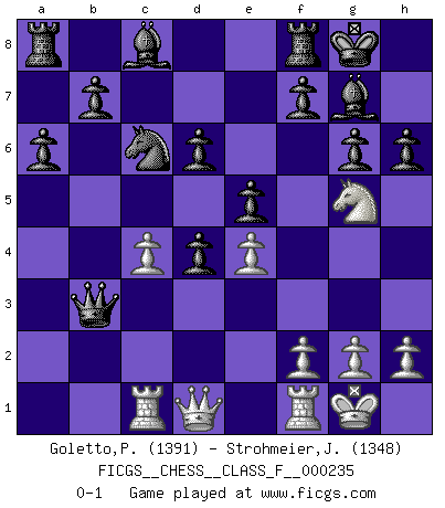 Last move : 0-1 2023 October 5 22:54:3 [Event "FICGS__CHESS__CLASS_F__000235"] [Site "FICGS"] [Date "2023.05.12"] [Round "1"] [White "Goletto,Piero Giuseppe"] [Black "Strohmeier,Josef"] [Result "0-1"] [WhiteElo "1391"] [BlackElo "1348"] 1.e4 c5 2.Nf3 Nc6 3.Bb5 g6 4.Nc3 Bg7 5.O-O e6 6.d4 cxd4 7.Ne2 e5 8.Bg5 Nge7 9.c3 Qb6 10.c4 O-O 11.Bxe7 Nxe7 12.Ng5 a6 13.Ba4 Qxb2 14.Rc1 Qxa2 15.Rc2 Qxa4 16.Nc1 Nc6 17.Nd3 d6 18.Nb2 Qb3 19.Rc1 Qxb2 20.Rc2 Qb3 21.Rc1 h6 0-1 This chess game has been lost on time (started : 2023.05.12 23:13:39) Follow this game move after move (download)Good positions don't win games, good moves do. (Gerald Abrahams) Kein Großmeister ist normal. Sie unterscheiden sich nur im Ausmaß Ihrer Verrücktheit. (Viktor Kortschnoi) Tu sabes que vas a perder. Aún cuando tenía la ventaja, yo sabía que iba a perder. - al estar jugando con Fischer (Andrew Soltis) Les échecs sont un jeu par leur forme, un art par leur essence et une science par sa difficulté d'acquisition. Ils peuvent vous procurer autant de plaisir qu'un bon livre ou une belle musique, mais vous n'aurez une réelle joie que si vous arrivez à bien jouer. (Tigran Petrosian) The man who strikes first admits that his ideas have given out. (Chinese proverb)