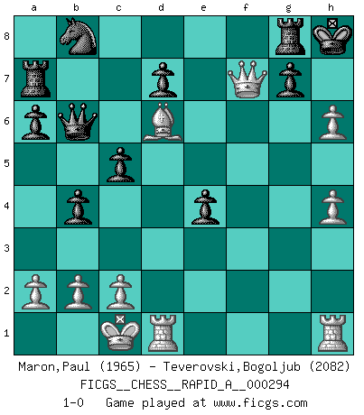 Last move : 1-0 2023 June 26 23:33:1 [Event "FICGS__CHESS__RAPID_A__000294"] [Site "FICGS"] [Date "2023.05.15"] [Round "1"] [White "Maron,Paul"] [Black "Teverovski,Bogoljub"] [Result "1-0"] [WhiteElo "1965"] [BlackElo "2082"] 1.e4 c5 2.Nc3 a6 3.g3 b5 4.Bg2 Bb7 5.d3 e6 6.f4 b4 7.Nce2 f5 8.Nf3 fxe4 9.Nd2 exd3 10.Bxb7 dxe2 11.Qxe2 Ra7 12.Bg2 Nf6 13.f5 Bd6 14.Nc4 Qc7 15.Nxd6+ Qxd6 16.Bf4 Qb6 17.O-O-O O-O 18.Bd6 Re8 19.g4 h6 20.h4 exf5 21.Qc4+ Kh8 22.g5 Ne4 23.Qf7 Rg8 24.Bxe4 fxe4 25.gxh6 1-0 Follow this game move after move (download)Every Pawn is a potential Queen. (James Mason) Schach ist Kampf, hauptsächlich jedoch gegen die eigenen Fehler. (Savielly Grigorievitsch Tartakower) Con el fin de mejorar tu juego, debes de estudiar los finales antes que todo, ya que mientras que los finales pueden ser estudiados y dominados por sí mismos, el juegomedio y la apertura deben de ser estudiados en relación con los finales. (José Raúl Capablanca) 'L'échange des dames est un coup dur pour les deux adversaires...' Un journaliste lors d'une partie du match Spassky-Fischer The obstacle is the path. (Zen proverb)