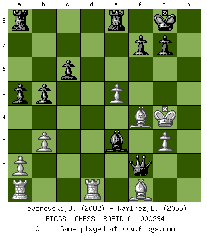 Last move : 0-1 2023 July 16 10:58:57 [Event "FICGS__CHESS__RAPID_A__000294"] [Site "FICGS"] [Date "2023.05.15"] [Round "1"] [White "Teverovski,Bogoljub"] [Black "Ramirez,Eliecer"] [Result "0-1"] [WhiteElo "2082"] [BlackElo "2055"] 1.d4 d5 2.c4 c6 3.Nf3 Nf6 4.e3 e6 5.Bd3 dxc4 6.Bxc4 Nbd7 7.O-O Bd6 8.Qc2 O-O 9.Rd1 Qe7 10.Nbd2 e5 11.dxe5 Nxe5 12.Nxe5 Bxe5 13.Nf1 a5 14.e4 Re8 15.f4 Bb8 16.e5 Ng4 17.g3 Ba7+ 18.Kg2 Qc5 19.h3 Qg1+ 20.Kf3 h5 21.b3 Qh1+ 22.Qg2 Nxe5+ 23.fxe5 Bg4+ 24.hxg4 hxg4+ 25.Kxg4 Qxg2 26.Bf4 b5 27.Ne3 Bxe3 28.Bf1 Qf2 0-1 Follow this game move after move (download)If cunning alone were needed to excel, women would be the best Chess players. (Albin) Du kannst im Schach nur gut werden, wenn du das Spiel liebst. (Robert James Fischer) Observen a Garry Kasparov. Después de una derrota, invariablemente el gana la próxima partida. Prácticamente hace pedazos a su siguiente oponente. Eso es algo que tenemos que aprender a lograr. (Maurice Ashley) À la honte des hommes, on sait que les lois du jeu sont les seules qui soient partout justes, claires, inviolables et exécutées. Pourquoi l'Indien qui a donné les règles du jeu d'échecs est-il obéi de bon gré dans toute la terre, et que les décrétales des papes, par exemple, sont aujourd'hui un objet d'horreur et de mépris ? C'est que l'inventeur des échecs combina tout avec justesse pour la satisfaction des joueurs, et que les papes, dans leurs décrétales, n'eurent en vue que leur seul avantage. L'Indien voulut exercer également l'esprit des hommes et leur donner du plaisir; les papes ont voulu abrutir l'esprit des hommes. Voltaire (Dictionnaire philosophique / Garnier 1967) There is far too much law for those who can afford it and far too little for those who cannot. (Derek Bok)