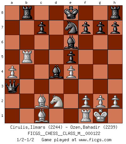 Last move : 1/2-1/2 2023 June 10 2:31:39 [Event "FICGS__CHESS__CLASS_M__000122"] [Site "FICGS"] [Date "2023.05.15"] [Round "1"] [White "Cirulis,Ilmars"] [Black "Ozen,Bahadir"] [Result "1/2-1/2"] [WhiteElo "2244"] [BlackElo "2239"] 1.e4 e5 2.Nf3 Nc6 3.Bc4 Bc5 4.b4 Bxb4 5.c3 Ba5 6.d4 d6 7.Qb3 Qd7 8.O-O Bb6 9.Bb5 a6 10.Ba4 Ba7 11.Qb2 b5 12.Bc2 Rb8 13.a4 b4 14.dxe5 dxe5 15.cxb4 Qd6 16.b5 Nd4 17.Nbd2 Ne7 18.Rb1 Be6 19.Nxd4 Bxd4 20.Qa3 axb5 21.Rxb5 Qxa3 1/2-1/2 Follow this game move after move (download)He who takes the Queen's Knight's Pawn will sleep in the streets. (Anonymous) Du weisst es gibt ein Problem mit Computern und Fernschach, wenn jeder eine Rating von 2450 hat. (John Christen Knudsen) El arma más poderosa en el Ajedrez, es tener la próxima movida. (David Bronstein) Mais l'homme est une créature légère et illogique : semblable au joueur d'échecs, il n'aime que le processus du but à atteindre, non le but lui-même. (Dostoïevsky) Any activity becomes creative when the doer cares about doing it right or doing it better. (John Updike)