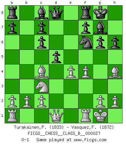 Last move : 0-1 2007 November 18 19:24:50 [Event "FICGS__CHESS__CLASS_B__000027"] [Site "FICGS"] [Date "2007.09.01"] [Round "1"] [White "Turakainen,Pekka I."] [Black "Vasquez,Fernando"] [Result "0-1"] [WhiteElo "1833"] [BlackElo "1872"] 1.e4 e5 2.Nf3 d6 3.d4 exd4 4.Nxd4 g6 5.Nc3 Bg7 6.Bc4 Nf6 7.O-O O-O 8.Bg5 h6 9.Bh4 Nc6 10.Nxc6 bxc6 11.f4 d5 0-1 Philidor : Larsen variation Kingside Castling by player White (move 7) Kingside Castling by player Black (move 7) Player Black won this chess game. Follow this game move after move (download)A thorough understanding of the typical mating continuations makes the most complicated sacrificial combinations leading up to them not only not difficult, but almost a matter of course. (Siegbert Tarrasch) Schach ist die gewalttätigste aller Sportarten. (Garry Kasparov) La estratégia requiere pensar, la táctica requiere observación. (Max Euwe) Dieu déplace le joueur, et celui-ci la pièce. Quel Dieu derrière Dieu commence donc la trame ? Arturo Perez-Reverte (prix de littérature policière 1993). He who is a good ruler must first have been ruled. (Aristotle)