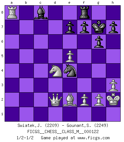 Last move : 1/2-1/2 2023 July 9 14:27:23 [Event "FICGS__CHESS__CLASS_M__000122"] [Site "FICGS"] [Date "2023.05.15"] [Round "1"] [White "Swiatek,Janusz"] [Black "Gounant,Stanislas"] [Result "1/2-1/2"] [WhiteElo "2209"] [BlackElo "2249"] 1.d4 g6 2.e4 d6 3.Nc3 Nf6 4.Be3 Bg7 5.Qd2 c6 6.Nf3 O-O 7.Bh6 b5 8.a3 Qb6 9.h3 Nbd7 10.Bxg7 Kxg7 11.e5 dxe5 12.dxe5 Nd5 13.Nxd5 cxd5 14.Be2 Nc5 15.O-O Ne4 16.Qf4 b4 17.axb4 Qxb4 18.b3 a5 19.Rfd1 a4 20.Rxd5 axb3 21.Rxa8 b2 22.Rd1 b1Q 23.Rxb1 Qxb1+ 24.Kh2 Qxc2 25.Nd4 Qd2 26.Qxd2 1/2-1/2 Follow this game move after move (download)Some sacrifices are sound; the rest are mine. (Mikhail Tal) Je älter ich werde, um so mehr schätze ich die Bauern. (Paul Keres) Cuando la partida de Ajedrez termina, el Peón y el Rey regresan a la misma caja. (Irish saying) Nous vivons dans un monde échiquéen : chaque jour qui passe est un défi à relever. (Philosophe Sasha) The only thing that matters is the evidence. (Horatio Caine, C.S.I. Miami)