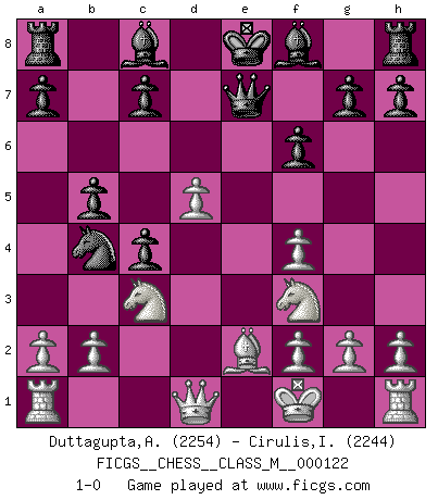Last move : 1-0 2023 May 25 13:36:11 [Event "FICGS__CHESS__CLASS_M__000122"] [Site "FICGS"] [Date "2023.05.15"] [Round "1"] [White "Duttagupta,Aniruddha"] [Black "Cirulis,Ilmars"] [Result "1-0"] [WhiteElo "2254"] [BlackElo "2244"] 1.d4 f5 2.Bg5 Nf6 3.Bxf6 exf6 4.e3 d5 5.c4 f4 6.exf4 Qe7+ 7.Be2 dxc4 8.Nc3 Nc6 9.d5 Nb4 10.Kf1 b5 11.Nf3 1-0 Follow this game move after move (download)The blunders are all there on the board, waiting to be made. (Savielly Tartakover) Der Knackpunkt bei der Konzentration ist, daß wir nur durch sie etwas Neues und Ungewöhnliches am Schachbrett finden können. Sie ist der einzige Weg durch neue neue Ideen eine Überraschung zu bereiten. (Garry Kasparov) Yo no creo en la psicología. Yo creo en las buenas movidas. (Bobby Fischer) Seul un grand joueur sait à quel point il joue faiblement. (Xavier Tartacover) Two beer, or not two beer. (Unknown)