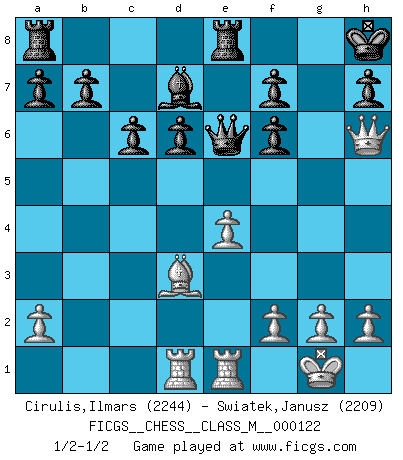 Last move : 1/2-1/2 2023 July 5 20:26:4 [Event "FICGS__CHESS__CLASS_M__000122"] [Site "FICGS"] [Date "2023.05.15"] [Round "1"] [White "Cirulis,Ilmars"] [Black "Swiatek,Janusz"] [Result "1/2-1/2"] [WhiteElo "2244"] [BlackElo "2209"] 1.e4 e5 2.Nf3 Nc6 3.Bc4 Bc5 4.b4 Bxb4 5.c3 Ba5 6.d4 exd4 7.Qb3 Qe7 8.O-O Bb6 9.cxd4 Nxd4 10.Nxd4 Bxd4 11.Nc3 Nf6 12.Bg5 c6 13.Rad1 Bxc3 14.Qxc3 O-O 15.Bxf6 gxf6 16.Qh3 d6 17.Qh4 Re8 18.Rfe1 Kh8 19.Bd3 Bd7 20.Qh6 Qe6 1/2-1/2 Follow this game move after move (download)The enormous mental resilience, without which no Chess player can exist, was so much taken up by Chess that he could never free his mind of this game. (Albert Einstein) Nie in meinem Leben habe ich die französische Verteidigung gespielt, welche die Stumpfsinnigste von allen ist. (Wilhelm Steinitz) Evita las multitudes. Haz independientemente tu propio razonamiento. Trata de ser el jugador de Ajedrez, no la pieza de Ajedrez. (Ralph Charell) Les Echecs ont trois composantes : le temps, l'espace et le matériel en dernier. (Mikhail Tal) It's not a bug - it's an undocumented feature. (Anonymous)