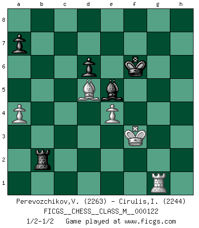 Last move : 1/2-1/2 2023 June 29 1:0:45 [Event "FICGS__CHESS__CLASS_M__000122"] [Site "FICGS"] [Date "2023.05.15"] [Round "1"] [White "Perevozchikov,Vjacheslav"] [Black "Cirulis,Ilmars"] [Result "1/2-1/2"] [WhiteElo "2263"] [BlackElo "2244"] 1.Nf3 f5 2.e4 fxe4 3.Ng5 Nf6 4.d3 e6 5.dxe4 Nc6 6.Bd3 Bc5 7.Nc3 O-O 8.f4 e5 9.Nd5 exf4 10.Nxf6+ Qxf6 11.Bc4+ Kh8 12.Qh5 h6 13.Nf7+ Rxf7 14.Qxf7 Qxf7 15.Bxf7 g5 16.h4 Kg7 17.Bb3 Nd4 18.hxg5 hxg5 19.Bd2 d6 20.Bc3 Bg4 21.Kd2 Kg6 22.Bc4 b5 23.Bxd4 Bxd4 24.Bxb5 Rb8 25.a4 f3 26.gxf3 Bxf3 27.Rhe1 Be5 28.Ke3 g4 29.Rf1 c6 30.Rxf3 gxf3 31.Bxc6 Rc8 32.Rg1+ Kf6 33.Bd5 Rxc2 34.Kxf3 Rxb2 1/2-1/2 Follow this game move after move (download)Pawn endings are to Chess what putting is to golf. (Cecil Purdy) Ich möchte Schüler heranbilden, die das Vermögen haben, selbst zu denken und Kritik zu üben. (Emanuel Lasker) Por esta medida (el intervalo entre Fischer y sus contemporaneos), yo le considero el mas grande campeón mundial. (Garry Kasparov) Le système Elo représente seulement une moyenne. Il est simplement un indicateur de votre stabilité. (Anatoli Karpov) The weakness of an artist is dogma. (Josh Waitzkin)