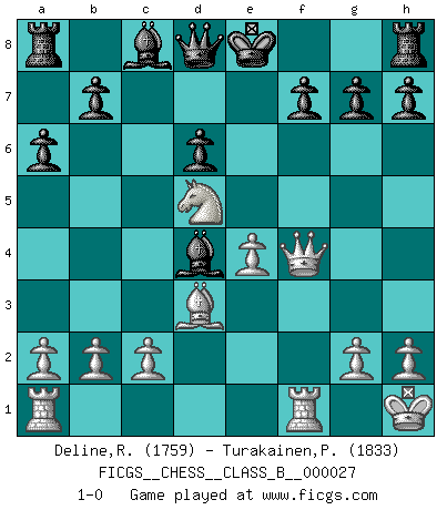 Last move : 1-0 2007 November 16 19:20:14 [Event "FICGS__CHESS__CLASS_B__000027"] [Site "FICGS"] [Date "2007.09.01"] [Round "1"] [White "Deline,Ralph"] [Black "Turakainen,Pekka I."] [Result "1-0"] [WhiteElo "1759"] [BlackElo "1833"] 1.e4 c5 2.Nf3 d6 3.d4 cxd4 4.Nxd4 Nf6 5.Nc3 a6 6.Be3 e6 7.Bd3 Be7 8.O-O Nc6 9.f4 Nxd4 10.Bxd4 e5 11.Be3 Ng4 12.Qf3 Nxe3 13.Qxe3 exf4 14.Qxf4 Bf6 15.Nd5 Bd4 16.Kh1 1-0 Sicilian : Najdorf, Byrne (English) attack Kingside Castling by player White (move 8) Player White won this chess game. Follow this game move after move (download)The enormous mental resilience, without which no Chess player can exist, was so much taken up by Chess that he could never free his mind of this game. (Albert Einstein) Das Schach ist nichts für kleine Geister, es beansprucht einen vollen Mann, der sich nicht sklavisch an das Überlieferte hält, sondern selbständig die Tiefen des Spiels zu ergründen sucht. (Wilhelm Steinitz) El Ajedrez es un juego terrible. Si no dominas el centro, tu oponente tiene una posición mas libre. Si tu tienes el centro, entonces realmente tienes algo de que preocuparte. (Siegbert Tarrasch) Celui qui prend des risques peut perdre, celui qui n'en prend pas perd toujours. (Xavier Tartacover) Whenever people agree with me, I always feel I must be wrong. (Oscar Wilde)