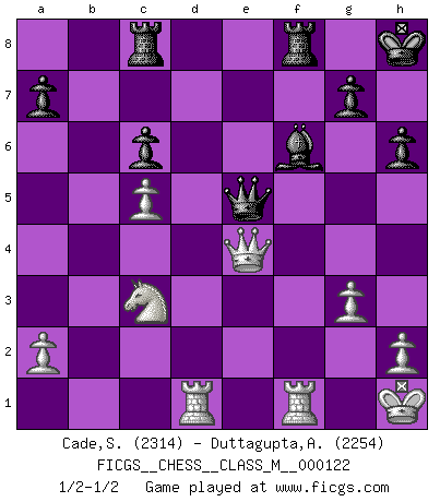 Last move : 1/2-1/2 2023 July 17 10:54:53 [Event "FICGS__CHESS__CLASS_M__000122"] [Site "FICGS"] [Date "2023.05.15"] [Round "1"] [White "Cade,Stephen"] [Black "Duttagupta,Aniruddha"] [Result "1/2-1/2"] [WhiteElo "2314"] [BlackElo "2254"] 1.d4 d5 2.Nf3 Nf6 3.g3 Bf5 4.Bg2 e6 5.O-O h6 6.c4 c6 7.Nc3 Nbd7 8.Nd2 Be7 9.e4 dxe4 10.Ndxe4 O-O 11.Be3 Nxe4 12.Nxe4 Nf6 13.Nc3 Rc8 14.Qe2 Ng4 15.Rad1 Nxe3 16.fxe3 Bg6 17.Be4 f5 18.Bg2 Bf6 19.c5 b6 20.b4 bxc5 21.bxc5 Kh8 22.Kh1 Qe8 23.e4 Bh5 24.Bf3 Bxf3+ 25.Qxf3 fxe4 26.Qxe4 e5 27.dxe5 Qxe5 1/2-1/2 Follow this game move after move (download)We don't really know how the game was invented, though there are suspicions. As soon as we discover the culprits, we'll let you know. (Bruce Pandolfini) Es hat in meinem Leben Zeiten gegeben, da ich sehr nahe daran war zu glauben, daß ich auch nicht eine einzige Schachpartie verlieren könnte. (José Raúl Capablanca) En manos de Fischer's, una diminuta ventaja teórica es tan buena como tener una Reina de ventaja. (Isaac Kashdan) Il vaut toujours mieux jouer un plan faux de façon logique que de n'avoir pas de plan du tout. (Victor Kortchnoï) Establishing goals is all right if you don't let them deprive you of interesting detours. (Doug Larson)