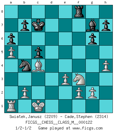 Last move : 1/2-1/2 2023 July 31 10:54:29 [Event "FICGS__CHESS__CLASS_M__000122"] [Site "FICGS"] [Date "2023.05.15"] [Round "1"] [White "Swiatek,Janusz"] [Black "Cade,Stephen"] [Result "1/2-1/2"] [WhiteElo "2209"] [BlackElo "2314"] 1.d4 d5 2.c4 e6 3.Nc3 Nf6 4.Bg5 dxc4 5.e3 c5 6.Bxf6 Qxf6 7.d5 a6 8.Nf3 exd5 9.Nxd5 Qd8 10.a4 g6 11.a5 Nc6 12.Bxc4 Bg7 13.Nb6 Qxd1+ 14.Kxd1 Rb8 15.Kc1 Bf5 16.Rd1 Rd8 17.Rxd8+ Kxd8 18.Bxf7 Kc7 19.Bc4 Be4 20.Nd5+ Bxd5 21.Bxd5 Nb4 22.Bc4 Rf8 23.h4 1/2-1/2 Follow this game move after move (download)There are two types of sacrifices: correct ones and mine. (Mikhail Tal) Wie bekannt hörte Morphy 1859 auf, Schach zu spielen. Seine Enttäuschung galt nicht so sehr dem Schach, wie den Schachspielern. (Robert James Fischer) Debemos de asegurarnos de que el Ajedrez no se convierta en un lenguaje muerto, muy interesante, pero tan solo para un grupo muy pequeño. (Sytze Faber) Vouloir jouer aux échecs contre soi-même est aussi paradoxal que vouloir marcher sur son ombre. (Stefan Zweig) Empty your mind, be formless, shapeless — like water. (Bruce Lee)