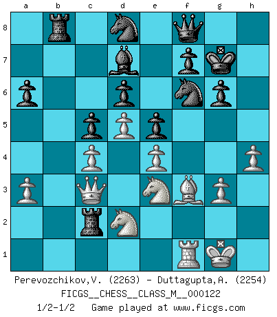 Last move : 1/2-1/2 2023 September 4 22:7:43 [Event "FICGS__CHESS__CLASS_M__000122"] [Site "FICGS"] [Date "2023.05.15"] [Round "1"] [White "Perevozchikov,Vjacheslav"] [Black "Duttagupta,Aniruddha"] [Result "1/2-1/2"] [WhiteElo "2263"] [BlackElo "2254"] 1.Nf3 Nf6 2.g3 g6 3.Bg2 Bg7 4.O-O O-O 5.c4 c5 6.Nc3 Nc6 7.d4 d6 8.d5 Na5 9.Nd2 a6 10.Rb1 Rb8 11.b3 b5 12.Qc2 e5 13.e4 Bd7 14.Nd1 h5 15.Re1 h4 16.Bf1 hxg3 17.fxg3 Bh6 18.Nf3 Bxc1 19.Rxc1 Kg7 20.Be2 Qe7 21.Ne3 bxc4 22.bxc4 Rb4 23.Nd2 Rfb8 24.Qc3 Nb7 25.a3 Rb6 26.h4 Nd8 27.Rf1 Rb2 28.Bf3 Qf8 29.Rc2 Rxc2 1/2-1/2 Follow this game move after move (download)The laws of Chess do not permit a free choice: you have to move whether you like it or not. (Emanuel Lasker) Alle Schachspieler sollten auch ein Hobby haben. (Savielly Grigorievitsch Tartakower) ¿Cual es el objetivo de jugar una apertura de gambito?... Para adquirir una reputación de ser un jugador apuesto a costo de perder el juego. (Siegbert Tarrasch) Ce n'est pas pour s'amuser qu'il joue aux échecs : il célèbre un culte. (Vladimir Nabokov) The greatest con, that he ever pulled... was making you believe... that he is you. (Revolver, movie)