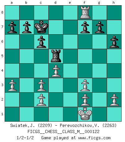 Last move : 1/2-1/2 2023 August 29 11:13:57 [Event "FICGS__CHESS__CLASS_M__000122"] [Site "FICGS"] [Date "2023.05.15"] [Round "1"] [White "Swiatek,Janusz"] [Black "Perevozchikov,Vjacheslav"] [Result "1/2-1/2"] [WhiteElo "2209"] [BlackElo "2263"] 1.d4 e6 2.e4 d5 3.Nc3 Nf6 4.Bg5 h6 5.Bxf6 Qxf6 6.exd5 Bb4 7.dxe6 Bxe6 8.a3 Bxc3+ 9.bxc3 Nd7 10.Nf3 O-O-O 11.Bd3 Bg4 12.O-O Bxf3 13.Qxf3 Qxf3 14.gxf3 Nf6 15.Rfe1 Rhe8 16.Kf1 c6 17.Bc4 Rxe1+ 18.Rxe1 Nd5 19.Bxd5 Rxd5 20.Re8+ Kd7 21.Rb8 Kc7 22.Rf8 1/2-1/2 Follow this game move after move (download)It is always better to sacrifice your opponent's men. (Savielly Tartakower) Aljechin war kein Nazi. Er war ein Opportunist. Ein schrecklicher Mann. Er liebte Geld über alles und würde für Geld ein Jude, ein Katolik oder ein Protestant werden. (Miguel Najdorf) Cuando veas una buena jugada, trata de encontrar otra mejor. (Emanuel Lasker) Vous savez, camarade Pachman, je n'éprouve pas de plaisir à être ministre, je jouerais plutôt aux échecs comme vous, ou alors ferais une révolution au Venezuela. (Che Guevara à Ludek Pachman, 'Checkmate in Prague', 1975) I'm extremely disappointed. I send you out for exciting, new designer drugs, you come back with tomato sauce. (Gregory House, House M.D.)