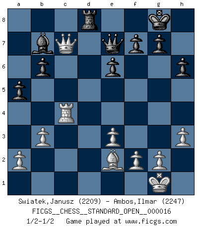 Last move : 1/2-1/2 2023 July 29 17:25:25 [Event "FICGS__CHESS__STANDARD_OPEN__000016"] [Site "FICGS"] [Date "2023.05.18"] [Round "2"] [White "Swiatek,Janusz"] [Black "Ambos,Ilmar"] [Result "1/2-1/2"] [WhiteElo "2209"] [BlackElo "2247"] 1.d4 d5 2.c4 e6 3.Nc3 Nf6 4.Bg5 Be7 5.e3 O-O 6.Nf3 h6 7.Bh4 b6 8.Rc1 Bb7 9.cxd5 Nxd5 10.Bxe7 Qxe7 11.Be2 Rc8 12.Nxd5 Bxd5 13.O-O c5 14.dxc5 Rxc5 15.Rxc5 Qxc5 16.Qb1 Nd7 17.Rc1 Qf8 18.Qc2 Nc5 19.b3 Qe7 20.Qc3 Rd8 21.h3 a5 22.Ne5 Bb7 23.Nc4 Ne4 24.Qe5 Qh4 25.Rf1 Nd2 26.Rc1 Nxc4 27.Rxc4 Qe7 28.Qc7 1/2-1/2 Follow this game move after move (download)It is not a move, even the best move that you must seek, but a realizable plan. (Eugene Znosko-Borovsky) Dass jemand wie Surab Asmaiparaschwili, der selbst Elopunkte gekauft hat , Vize-Präsident der Fide werden konnte, sagt schon einges über den Zustand dieser Organisation aus. (Joel Lautier) Una de estas pequeñas movidas modestas pudieran ser mas molestas a tu oponente que la amenaza mas grande. (Siegbert Tarrasch) Aidez vos pièces, elles vous aideront. (Paul Morphy) Experience is the name we all give to our mistakes. (Oscar Wilde)