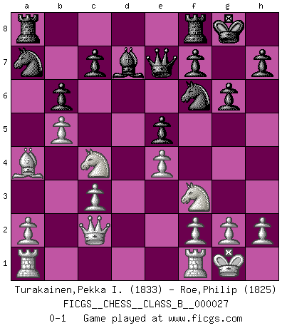 Last move : 0-1 2007 December 17 9:10:34 [Event "FICGS__CHESS__CLASS_B__000027"] [Site "FICGS"] [Date "2007.09.01"] [Round "1"] [White "Turakainen,Pekka I."] [Black "Roe,Philip"] [Result "0-1"] [WhiteElo "1833"] [BlackElo "1825"] 1.e4 e5 2.Nf3 Nc6 3.Bb5 a6 4.Ba4 d6 5.c3 Bd7 6.d4 g6 7.O-O Bg7 8.Be3 Nf6 9.Nbd2 O-O 10.dxe5 dxe5 11.b4 b6 12.Bb3 Qe7 13.Qc2 Ng4 14.Nc4 a5 15.Bg5 Bf6 16.Bxf6 Nxf6 17.b5 a4 18.Bxa4 Na7 0-1 This chess game has been lost on time (started : 2007.09.01 0:25:16) Ruy Lopez : Modern Steinitz defense, Fianchetto (Bronstein) variation Kingside Castling by player White (move 7) Kingside Castling by player Black (move 9) Player Black won this chess game. Follow this game move after move (download)Chess is a sea in which a gnat may drink and an elephant may bathe. (Hindu proverb) Das Spiel gibt uns die Genugtuung, die das Leben uns versagt. (Emanuel Lasker) No es tiempo de jugar al Ajedrez cuando la casa esta en llamas. (Proverbio Italiano) Des idées, des idées, j'en ai cent, j'en ai mille. Des bonnes, des mauvaises, applicables, irréalisables... Il suffit de faire le tri ! (Roos) Either move or be moved. (Ezra Pound)