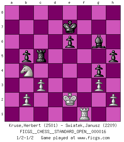 Last move : 1/2-1/2 2024 March 2 23:19:25 [Event "FICGS__CHESS__STANDARD_OPEN__000016"] [Site "FICGS"] [Date "2023.05.18"] [Round "2"] [White "Kruse,Herbert"] [Black "Swiatek,Janusz"] [Result "1/2-1/2"] [WhiteElo "2501"] [BlackElo "2209"] 1.Nf3 d5 2.g3 g6 3.d4 Bg7 4.Bg2 Nf6 5.c3 O-O 6.a4 b6 7.a5 Bb7 8.O-O c5 9.Qa4 Bc6 10.Qc2 e6 11.Bf4 Nbd7 12.Nbd2 Qe7 13.Ne5 Nxe5 14.Bxe5 Rfd8 15.Nf3 Be8 16.Rfd1 Rac8 17.axb6 axb6 18.Qb3 b5 19.dxc5 Qxc5 20.e3 h5 21.Ne1 Ne4 22.Bxg7 Kxg7 23.Nd3 Qc4 24.Qb4 Qxb4 25.Nxb4 Ra8 26.Rxa8 Rxa8 27.Bxe4 dxe4 28.Kg2 Kf6 29.f4 exf3+ 30.Kxf3 Ke7 31.e4 f6 32.Ke3 g5 33.Rf1 g4 34.Rd1 Ra7 35.Rc1 Ra8 36.e5 fxe5 37.Ke4 Rc8 38.Kxe5 Rc5+ 39.Kd4 Rc4+ 40.Ke3 Bg6 41.Ra1 Rc5 42.Rf1 Re5+ 43.Kd2 Rc5 44.Ke2 Bf5 45.Rf2 Be4 46.Ke3 Bg6 47.Kd4 Rc4+ 48.Ke3 Rc5 49.Kd2 Bf5 50.Rf4 Bb1 51.Ke2 Re5+ 52.Kd2 Rc5 53.Kd1 Bg6 54.Ke2 Bh7 55.Rf1 Bg6 1/2-1/2 Follow this game move after move (download)Of all my Russian books, the defense contains and diffuses the greatest 'warmth' which may seem odd seeing how supremely abstract Chess is supposed to be. (Vladimir Nabokov) Schach wird sich dank seiner hohen kulturellen Tradition immer durchsetzen. In näherer Zukunft womöglich sogar als Gegenreaktion auf die maßlose Reizüberflutung im Freizeit- und Spielbereich. (Garry Kasparov) El Ajedrez se juega con la mente... ¡no con las manos!. (Renaud y Kahn) Mais n'est-ce pas déjà le limiter injurieusement que d'appeler les échecs un jeu? N'est-ce pas aussi une science, un art, ou quelque chose qui, comme le cercueil de Mahomet entre ciel et terre, est suspendu entre l'un et l'autre, et qui réunit un nombre incroyable de contraires ? (Stefan Zweig) But they are useless. They can only give you answers. (Pablo Picasso, about computers)