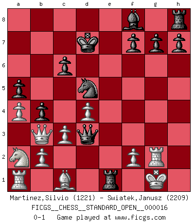 Last move : 0-1 2023 September 13 0:34:24 [Event "FICGS__CHESS__STANDARD_OPEN__000016"] [Site "FICGS"] [Date "2023.05.18"] [Round "1"] [White "Martinez,Silvio"] [Black "Swiatek,Janusz"] [Result "0-1"] [WhiteElo "1221"] [BlackElo "2209"] 1.e4 e5 2.Nf3 Nc6 3.Bb5 Nf6 4.Nc3 Nd4 5.Ba4 c6 6.Nxe5 d6 7.Nf3 Bg4 8.h3 Bxf3 9.gxf3 b5 10.Bb3 a5 11.a4 b4 12.Na2 d5 13.exd5 Nxd5 14.c3 Nxb3 15.Qxb3 Qf6 16.d4 Qxf3 17.Rg1 Kd7 18.Rg3 Re8+ 19.Kf1 Qh1+ 20.Rg1 Qxh3+ 21.Rg2 Qd3+ 22.Kg1 Re1+ 0-1 Follow this game move after move (download)The most powerful weapon in Chess is to have the next move. (David Bronstein) Ja, ich habe einmal eine Blitzpartie gespielt, es war in einem Zug, 1929. --im Interview 1989 (Mikhail Moiseyevich Botvinik) El Ajedrez moderno está demasiado preocupado con cosas como la estructura de Peones. Olvidenlo, el Jaque Mate termina la partida. (Nigel Short) Vous m'avez demandé de vous exposer quel est le fondement de la prière. Je ne fais que préparer les pièces du jeu sur la table... Nous sera-t-il permis d'en adopter les règles et si nous les appliquons scrupuleusement nous ne tarderons pas à faire mat le Roi divin ! Il ne pourra échapper à nos mains. (Sainte Thérèse d'Avila, Chemin de perfection) A clear conscience is usually the sign of a bad memory. (Unknown)