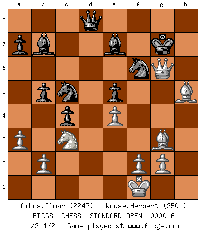 Last move : 1/2-1/2 2023 June 7 13:6:20 [Event "FICGS__CHESS__STANDARD_OPEN__000016"] [Site "FICGS"] [Date "2023.05.18"] [Round "1"] [White "Ambos,Ilmar"] [Black "Kruse,Herbert"] [Result "1/2-1/2"] [WhiteElo "2247"] [BlackElo "2501"] 1.d4 Nf6 2.c4 c6 3.Nf3 d5 4.Nc3 e6 5.Bg5 h6 6.Bh4 dxc4 7.e4 g5 8.Bg3 b5 9.Be2 Bb7 10.h4 Rg8 11.a3 Be7 12.hxg5 hxg5 13.Qd2 Qa5 14.Rd1 Nbd7 15.Kf1 c5 16.dxc5 Nxc5 17.Nxg5 Rd8 18.Qf4 Rxd1+ 19.Bxd1 e5 20.Qf5 Qd8 21.Nxf7 Kxf7 22.Rh7+ Rg7 23.Bh5+ Kg8 24.Rxg7+ Kxg7 25.Qg6+ 1/2-1/2 Follow this game move after move (download)If a ruler does not understand Chess, how can he rule over a kingdom ? (King Khusros II) Der vorletzte Fehler gewinnt. (Savielly Grigorievitsch Tartakower) Cuando veas una buena jugada, trata de encontrar otra mejor. (Emanuel Lasker) Le temps de noter son nom sur la feuille de partie, j'étais déjà en zeitnot ! D'un modeste amateur apparié lors de la première ronde d'un open contre le grand-maître Azmaïparashvili. If I had no sense of humor, I would long ago have committed suicide. (Mahatma Gandhi)