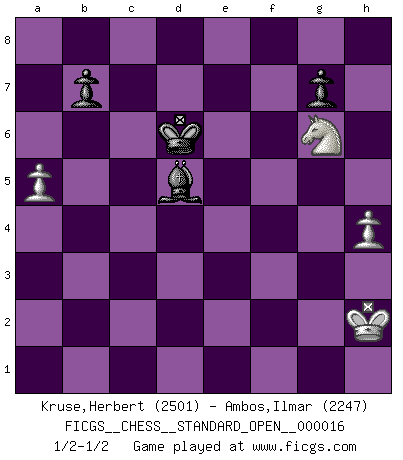 Last move : 1/2-1/2 2023 November 21 7:22:39 [Event "FICGS__CHESS__STANDARD_OPEN__000016"] [Site "FICGS"] [Date "2023.05.18"] [Round "2"] [White "Kruse,Herbert"] [Black "Ambos,Ilmar"] [Result "1/2-1/2"] [WhiteElo "2501"] [BlackElo "2247"] 1.Nf3 d5 2.d4 Nf6 3.Bf4 e6 4.e3 Bd6 5.Nbd2 O-O 6.Bd3 c5 7.dxc5 Bxc5 8.O-O Nc6 9.c4 Bd6 10.Bxd6 Qxd6 11.cxd5 Qxd5 12.Bc4 Qd6 13.Qa4 Qe7 14.Rfd1 Bd7 15.Qb5 Rab8 16.Rac1 Rfd8 17.Bf1 h6 18.h3 Qb4 19.Qxb4 Nxb4 20.a3 Nbd5 21.Ne5 Be8 22.Ndf3 Rbc8 23.Nd4 Ba4 24.Re1 Kf8 25.g4 Ne4 26.Bg2 Ndf6 27.f4 Nd6 28.b3 Be8 29.a4 Nfe4 30.h4 a5 31.Bf3 Ke7 32.Bxe4 Nxe4 33.Nc4 Rc5 34.Nb6 Rxc1 35.Rxc1 Nf6 36.Kf2 Nxg4+ 37.Kf3 e5 38.Nf5+ Kf6 39.Kxg4 h5+ 40.Kg3 Kxf5 41.Rc5 f6 42.fxe5 Rd3 43.exf6 Kxf6 44.Nd5+ Kf7 45.Rxa5 Rxb3 46.Rc5 Bc6 47.a5 Ke6 48.Nf4+ Kd6 49.Rxh5 Rxe3+ 50.Kh2 Rf3 51.Ng6 Rd3 52.Rg5 Rd5 53.Rxd5+ Bxd5 1/2-1/2 Follow this game move after move (download)Chess is a more highly symbolic game, but the aggressions are therefore even more frankly represented in the play. It probably began as a war game; that is, the representation of a miniature battle between the forces of two kingdoms. (Karl Meninger) Ja, jede Frau in Holland liebt mich bestimmt, und alle Männer hassen mich. (Loek van Wely) Puntos débiles o agujeros en la posición de tu oponente deben de ser ocupados por piezas, no Peones. (Siegbert Tarrasch) Vouloir jouer aux échecs contre soi-même est aussi paradoxal que vouloir marcher sur son ombre. (Stefan Zweig) Who needs drugs and alcohol if he can play Big Chess at FICGS ? (Heinz-Georg Lehnhoff)