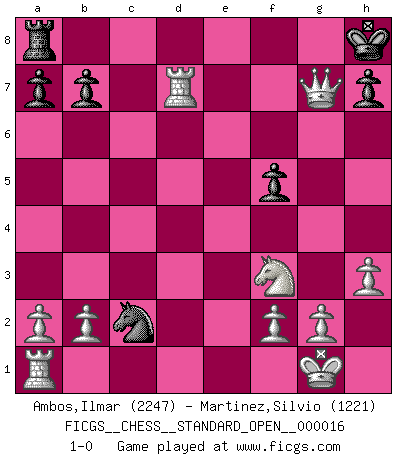 Last move : 1-0 2023 June 17 21:2:26 [Event "FICGS__CHESS__STANDARD_OPEN__000016"] [Site "FICGS"] [Date "2023.05.18"] [Round "2"] [White "Ambos,Ilmar"] [Black "Martinez,Silvio"] [Result "1-0"] [WhiteElo "2247"] [BlackElo "1221"] 1.d4 d5 2.c4 Nf6 3.Bf4 c5 4.dxc5 e6 5.Nf3 Bxc5 6.e3 O-O 7.Nc3 Nc6 8.Be2 Re8 9.O-O Bd6 10.Bxd6 Qxd6 11.cxd5 Nxd5 12.e4 Rd8 13.exd5 exd5 14.h3 Qg6 15.Bd3 f5 16.Nxd5 Rxd5 17.Bc4 Be6 18.Bxd5 Bxd5 19.Qxd5+ Qf7 20.Qxf7+ Kh8 21.Rfd1 Nb4 22.Rd7 Nc2 23.Qxg7+ 1-0 Follow this game move after move (download)One of these modest little moves may be more embarrassing to your opponent than the biggest threat. (Siegbert Tarrasch) Kein Großmeister ist normal. Sie unterscheiden sich nur im Ausmaß Ihrer Verrücktheit. (Viktor Kortschnoi) No volvere nunca a jugar contigo. Has insultado a mi amigo. - cuando un oponente se maldijo por una mala jugada (Miguel Najdorf) À la honte des hommes, on sait que les lois du jeu sont les seules qui soient partout justes, claires, inviolables et exécutées. Pourquoi l'Indien qui a donné les règles du jeu d'échecs est-il obéi de bon gré dans toute la terre, et que les décrétales des papes, par exemple, sont aujourd'hui un objet d'horreur et de mépris ? C'est que l'inventeur des échecs combina tout avec justesse pour la satisfaction des joueurs, et que les papes, dans leurs décrétales, n'eurent en vue que leur seul avantage. L'Indien voulut exercer également l'esprit des hommes et leur donner du plaisir; les papes ont voulu abrutir l'esprit des hommes. Voltaire (Dictionnaire philosophique / Garnier 1967) Panic is a sudden desertion of us, an a going over to the enemy of our imagination. (Christian Nevell Bovee)