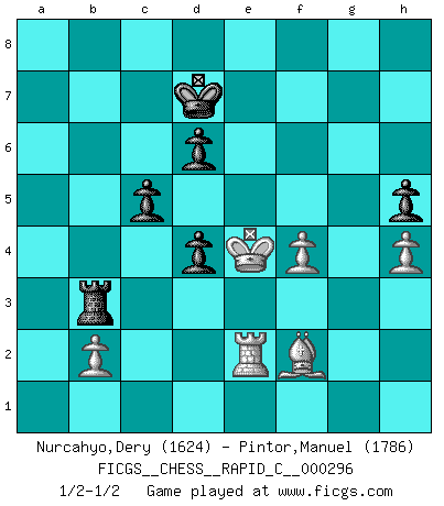 Last move : 1/2-1/2 2023 July 23 16:44:0 [Event "FICGS__CHESS__RAPID_C__000296"] [Site "FICGS"] [Date "2023.05.20"] [Round "1"] [White "Nurcahyo,Dery"] [Black "Pintor,Manuel"] [Result "1/2-1/2"] [WhiteElo "1624"] [BlackElo "1786"] 1.e4 e5 2.Ne2 Bc5 3.c3 Qf6 4.d4 exd4 5.cxd4 Bb6 6.e5 Qf5 7.Ng3 Qe6 8.Nc3 Nc6 9.Be3 d6 10.d5 Qxe5 11.dxc6 bxc6 12.Qf3 Ne7 13.O-O-O O-O 14.Bf4 Qa5 15.Bc4 Qc5 16.Bd3 Nd5 17.Qe4 f5 18.Qc4 Be6 19.Qxc5 Bxc5 20.Nxd5 cxd5 21.Rhe1 Bd7 22.Re7 Rf7 23.Rxf7 Kxf7 24.Bxf5 Bxf5 25.Nxf5 Kf6 26.Ne3 d4 27.Nd5+ Kf5 28.Bg3 Bb6 29.Nxb6 axb6 30.a3 Ra4 31.f3 g5 32.Kb1 h5 33.Bf2 c5 34.g3 b5 35.Ka2 b4 36.Kb3 Ra7 37.axb4 Rb7 38.Kc4 Rxb4+ 39.Kd5 Rb6 40.Rd2 Kf6 41.h3 Ke7 42.Re2+ Kd7 43.f4 gxf4 44.gxf4 Rb3 45.h4 Rf3 46.Ke4 Rb3 47.Kd5 Rf3 48.Ke4 Rb3 1/2-1/2 Follow this game move after move (download)Chess is the art which expresses the science of logic. (Mikhail Botvinnik) Ich rechne überhaupt nicht voraus. Ich gewinne auch so. (Robert James Fischer) Por la belleza de sus partidas, la claridad de su juego y lo brillante de sus ideas, Fischer se creó el mismo como un artista de la misma estatura como Brahms, Rembrandt y Shakespeare. (David Levy) Aidez vos pièces, elles vous aideront. (Paul Morphy) Programmer - an organism that turns coffee into software. (Anonymous)