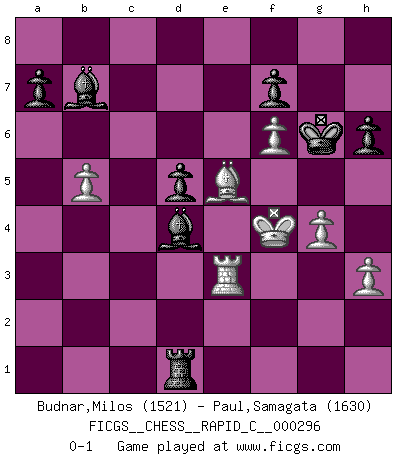 Last move : 0-1 2023 June 12 7:1:53 [Event "FICGS__CHESS__RAPID_C__000296"] [Site "FICGS"] [Date "2023.05.20"] [Round "1"] [White "Budnar,Milos"] [Black "Paul,Samagata"] [Result "0-1"] [WhiteElo "1521"] [BlackElo "1630"] 1.e4 e5 2.Nf3 Nc6 3.Bb5 d6 4.h3 Bd7 5.c3 h6 6.O-O Nge7 7.d4 exd4 8.Nxd4 Nxd4 9.Qxd4 Nc6 10.Bxc6 Bxc6 11.e5 d5 12.b4 Be7 13.Bf4 Qd7 14.Re1 Qe6 15.Nd2 b6 16.Bg3 O-O 17.Nf3 Bb7 18.a4 c5 19.bxc5 Bxc5 20.Qf4 g5 21.Qf6 Kh7 22.Nd4 Qxf6 23.exf6 Kg6 24.Be5 Rad8 25.a5 Rfe8 26.axb6 Bxb6 27.Rab1 Rc8 28.Re3 Ba6 29.g4 Rc4 30.Rb4 Rxb4 31.cxb4 Rc8 32.b5 Bb7 33.Kh2 Rc1 34.Kg3 Rd1 35.f4 gxf4+ 36.Kxf4 Bxd4 0-1 Follow this game move after move (download)White lost because he failed to remember the right continuation and had to think up the moves himself. (Siegbert Tarrasch) Der beste Spieler in einem Turnier gewinnt es nie. Er landet auf Platz zwei oder drei. (Siegbert Tarrasch) Coloca el contenido de las piezas del Ajedrez en un sombrero, agitalo vigorosamente, arrojalas en un tablero desde una altura de 30 centimetros y así obtendras el estilo de Steinitz. (H. E. Bird) Vous m'avez demandé de vous exposer quel est le fondement de la prière. Je ne fais que préparer les pièces du jeu sur la table... Nous sera-t-il permis d'en adopter les règles et si nous les appliquons scrupuleusement nous ne tarderons pas à faire mat le Roi divin ! Il ne pourra échapper à nos mains. (Sainte Thérèse d'Avila, Chemin de perfection) Begin at the beginning and go on till you come to the end; then stop. (Lewis Carrol, Alice in Wonderland)