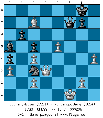 Last move : 0-1 2023 July 23 7:38:55 [Event "FICGS__CHESS__RAPID_C__000296"] [Site "FICGS"] [Date "2023.05.20"] [Round "1"] [White "Budnar,Milos"] [Black "Nurcahyo,Dery"] [Result "0-1"] [WhiteElo "1521"] [BlackElo "1624"] 1.e4 e5 2.Nf3 d6 3.Bb5+ c6 4.Bc4 h6 5.O-O Be6 6.Bxe6 fxe6 7.d3 Nf6 8.h3 Be7 9.Nc3 Na6 10.a3 O-O 11.d4 exd4 12.Nxd4 Qd7 13.Be3 Nc5 14.f3 Na6 15.f4 Nc5 16.e5 Nd5 17.Rf3 dxe5 18.fxe5 Rxf3 19.Qxf3 Rf8 20.Qg3 a5 21.Bxh6 Bd8 22.Rf1 Rxf1+ 23.Kxf1 Qf7+ 24.Ke1 Kh7 25.Bg5 Qg6 26.h4 Nxc3 27.bxc3 Ne4 28.Qe3 Bb6 29.Qf3 a4 30.Ke2 c5 31.Nxe6 Ba5 32.c4 Nc3+ 33.Kf1 Qxe6 34.Qd3+ Kg8 35.Bd8 b6 36.Bc7 Qf7+ 0-1 Follow this game move after move (download)I prefer to lose a really good game than to win a bad one. (David Levy) Moralische Siege zählen nicht. (Savielly Grigorievitsch Tartakower) Peones: ellos son el alma de esta partida, solos forman el ataque y la defensa. (Philidor) RxDa4 pat (...) You think that education is too expensive ? Try ignorance. (Derek Bok)