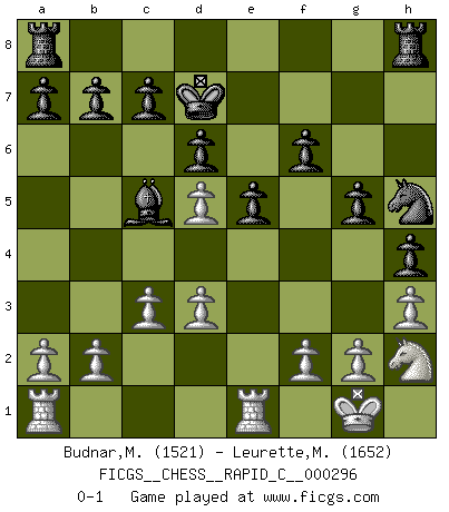 Last move : 0-1 2023 May 28 14:28:40 [Event "FICGS__CHESS__RAPID_C__000296"] [Site "FICGS"] [Date "2023.05.20"] [Round "1"] [White "Budnar,Milos"] [Black "Leurette,Marc-Antoine"] [Result "0-1"] [WhiteElo "1521"] [BlackElo "1652"] 1.e4 e5 2.Nf3 Nc6 3.Bb5 Nf6 4.Nc3 Bc5 5.O-O d6 6.h3 Bd7 7.Bxc6 Bxc6 8.d3 Qe7 9.Bg5 h6 10.Bh4 g5 11.Bg3 Nh5 12.Nh2 Nxg3 13.Re1 h5 14.Qf3 h4 15.Qg4 f6 16.Nd5 Bxd5 17.exd5 Nh5 18.c3 Qd7 19.Qxd7 Kxd7 0-1 Follow this game move after move (download)When you don't know what to play, wait for an idea to come into your opponent's mind. You may be sure that idea will be wrong. (Siegbert Tarrasch) Ich hatte Angst gegen einen russischen Großmeister zu verlieren, und er befürchtete gegen einen kleinen Jungen zu verlieren. (über ein Remis gegen Juri Awerbach). (Robert James Fischer) Solo existe una cosa que Fischer hace en el Ajedrez sin placer: ¡perder!. (Boris Spassky) Assurément je connaissais par expérience le mystérieux attrait de ce jeu royal, le seul entre tous les jeux inventés par les hommes qui échappe souverainement à la tyrannie du hasard, le seul où l'on ne doive sa victoire qu'à son intelligence ou plutôt à une certaine forme d'intelligence. Mais n'est-ce pas déjà le limiter injurieusement que d'appeler les échecs un jeu ? N'est-ce pas une science, un art ou quelque chose qui, comme le cercueil de Mahomet entre ciel et terre, est suspendu entre l'un et l'autre, et qui réunit un nombre incroyable de contraires ? [...] C'est une pensée qui ne mène à rien, une mathématique qui n'établit rien, un art qui ne laisse pas d'uvre, une architecture sans matière; et il l'a prouvé néanmoins qu'il était plus durable, à sa manière, que les livres ou que tout autre monument, ce jeu unique qui appartient à tous les peuples et à tous les temps, et dont personne ne sait quel dieu en fit don à la terre pour tuer l'ennui, pour aiguiser l'esprit et stimuler l'âme. Où commence-t-il, où finit-il ? (Stefan Zweig) Internet: Absolute communication, absolute isolation. (Paul Carvel)