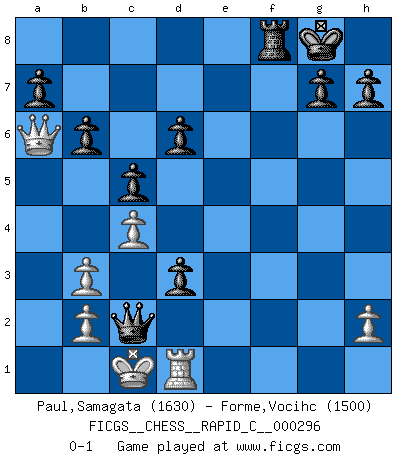 Last move : 0-1 2023 June 10 20:59:6 [Event "FICGS__CHESS__RAPID_C__000296"] [Site "FICGS"] [Date "2023.05.20"] [Round "1"] [White "Paul,Samagata"] [Black "Forme,Vocihc"] [Result "0-1"] [WhiteElo "1630"] [BlackElo "1500"] 1.e4 c5 2.c4 Nc6 3.Nf3 e5 4.Nc3 d6 5.d3 Be7 6.Nd5 f5 7.Nxe7 Ngxe7 8.exf5 Bxf5 9.Be3 O-O 10.Be2 Ng6 11.Qb3 Nd4 12.Nxd4 exd4 13.Bd2 Qe7 14.Kd1 b6 15.Re1 Qh4 16.Bf3 Bg4 17.Kc2 Bxf3 18.gxf3 Rxf3 19.Re2 Ne5 20.Rae1 Rxd3 21.Qb5 Rf3 22.Kb1 Raf8 23.Qa6 d3 24.Re3 Qxf2 25.Rxf3 Nxf3 26.Rd1 Nxd2+ 27.Kc1 Nb3+ 28.axb3 Qc2+ 0-1 Follow this game move after move (download)Winning isn't everything... but losing is nothing. (Mednis) Ich habe Kasparov in Rente geschickt. (Veselin Topalov) El Ajedrez por encima de todo... ¡es una pelea!. (Emanuel Lasker) Psychologiquement, tu dois avoir confiance en toi même, mais cette confiance doit être basée sur des faits. (Robert Fischer) You have to believe in yourself. (Sun Tzu)