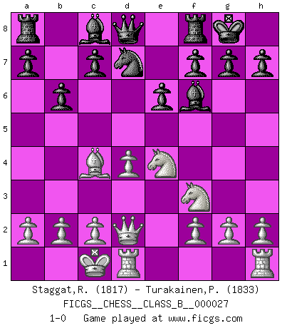 Last move : 1-0 2007 November 12 7:6:3 [Event "FICGS__CHESS__CLASS_B__000027"] [Site "FICGS"] [Date "2007.09.01"] [Round "1"] [White "Staggat,Rolf"] [Black "Turakainen,Pekka I."] [Result "1-0"] [WhiteElo "1817"] [BlackElo "1833"] 1.e4 e6 2.d4 d5 3.Nc3 Nf6 4.Bg5 dxe4 5.Nxe4 Be7 6.Bxf6 Bxf6 7.Nf3 O-O 8.Qd2 Nd7 9.O-O-O b6 10.Bc4 1-0 This chess game has been lost on time (started : 2007.09.01 0:25:16) French : Burn variation Kingside Castling by player Black (move 7) Queenside Castling by player White (move 9) Player White won this chess game. Follow this game move after move (download)One bad move nullifies forty good ones. (Horowitz) Nicht daß Diemer aus Opportunismus Mitglied der NSDAP geworden wäre. Er war ein Fanatiker, in allem, was er tat. (Hans Ree) Un buen sacrificio es aquel que aunque no sea necesariamente sólido, deja a tu oponente aturdido y confuso. (Rudolph Spielmann) J'ai toujours senti une vague pitié pour l'homme qui ne connaît rien aux échecs, tout comme j'en aurais pour un homme ignorant de l'amour. Les Echecs, comme la musique ou comme l'amour, ont le pouvoir de rendre heureux. (Siegbert Tarrasch) The difference between stupidity and genius is that genius has its limits. (Murphy)