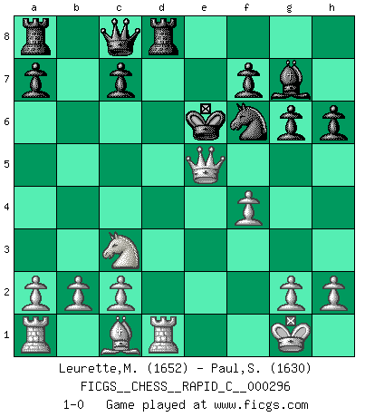 Last move : 1-0 2023 May 22 13:50:28 [Event "FICGS__CHESS__RAPID_C__000296"] [Site "FICGS"] [Date "2023.05.20"] [Round "1"] [White "Leurette,Marc-Antoine"] [Black "Paul,Samagata"] [Result "1-0"] [WhiteElo "1652"] [BlackElo "1630"] 1.e4 e5 2.Nf3 Nc6 3.Bc4 h6 4.Nc3 d6 5.d4 exd4 6.Nxd4 Nxd4 7.Qxd4 Bd7 8.Qd5 Be6 9.Qxb7 Bxc4 10.Qc6+ Ke7 11.Qxc4 Nf6 12.O-O g6 13.Re1 Bg7 14.e5 dxe5 15.Rd1 Qc8 16.Qc5+ Ke6 17.f4 Rd8 18.Qxe5+ 1-0 Follow this game move after move (download)Tactics flow from a superior position. (Bobby Fischer) Kasparov stellt für gewöhnlich die Regeln auf und bricht sie dann selbst wieder. (Alexej Shirov) Después de la respuesta de las negras a 1.e4 con 1..e5, se quedan siempre tratando de entrar dentro del juego. (Howard Staunton) Dans le domaine de la peinture, de la gravure et de la sculpture, dès la première décennie de notre siècle, les artistes abandonnent la représentation de la partie d'échecs pour se concentrer sur les pièces, sur les échiquiers et sur toutes les variations auxquelles les unes et les autres peuvent donner lieu. On passe en quelque sorte d'un thème social à un thème musical (au sens de la musica médiévale, c'est-à-dire d'une notion qui inclue le rythme, l'harmonie, la construction et la déconstruction, etc.). Graphiquement et picturalement, l'échiquier apparaît comme une structure ouverte, dynamique, d'une richesse infinie, autorisant toutes les combinatoires et débouchant sur des mouvements et des rythmes de nature exponentielle. (Michel Pastoureau) A cynic is a man who knows the price of everything but the value of nothing. (Oscar Wilde)