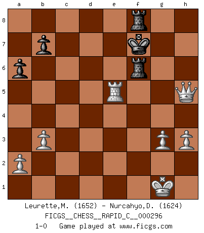 Last move : 1-0 2023 July 31 9:15:26 [Event "FICGS__CHESS__RAPID_C__000296"] [Site "FICGS"] [Date "2023.05.20"] [Round "1"] [White "Leurette,Marc-Antoine"] [Black "Nurcahyo,Dery"] [Result "1-0"] [WhiteElo "1652"] [BlackElo "1624"] 1.e4 e5 2.Nf3 d6 3.Nc3 c6 4.d4 exd4 5.Qxd4 h6 6.Bc4 Be6 7.Be3 Nd7 8.O-O Ngf6 9.Bxe6 fxe6 10.Rfe1 e5 11.Qd3 Be7 12.h3 O-O 13.Qc4+ Kh8 14.Nh4 Qe8 15.Qe6 Qf7 16.Qxe7 Qh5 17.Nf5 Rf7 18.Qe6 d5 19.Ng3 Qg6 20.exd5 cxd5 21.Nxd5 Re8 22.Qd6 Qxc2 23.Nxf6 Nxf6 24.b3 Rd7 25.Qa3 a6 26.Rac1 Qd3 27.Qb2 h5 28.Bg5 Rde7 29.Bxf6 gxf6 30.Nxh5 Qg6 31.Ng3 f5 32.Qe2 f4 33.Qe4 Qb6 34.Nf5 Re6 35.Qf3 Kg8 36.Qh5 Qd8 37.Re4 Qf6 38.Rc7 Qg6 39.Rg7+ Qxg7 40.Nxg7 Kxg7 41.g3 Rh8 42.Qg5+ Kf7 43.Rxe5 fxg3 44.Rf5+ Ke8 45.Re5 Kf7 46.Qf5+ Rf6 47.Qd7+ Kg6 48.fxg3 Rhf8 49.Qg4+ Kf7 50.Qh5+ 1-0 Follow this game move after move (download)I have added these principles to the law: get the Knights into action before both Bishops are developed. (Emanuel Lasker) Im Schach gewinnt jeder. Hat man Freunde am Spiel - und das ist die Hauptsache - ist auch der Verlust einer Partie kein Unglück. (David Bronstein) ¿Esta Bobby Fischer algo cuerdo?. (Salo Flohr) Comme les marins qui ont mille raisons différentes d'aller en mer, les joueurs d'échecs en ont tout autant avant de s'installer devant une table et jouer... (Vincent Bertignac, philosophe) Art is not a thing, it is a way. (Elbert Hubbard)
